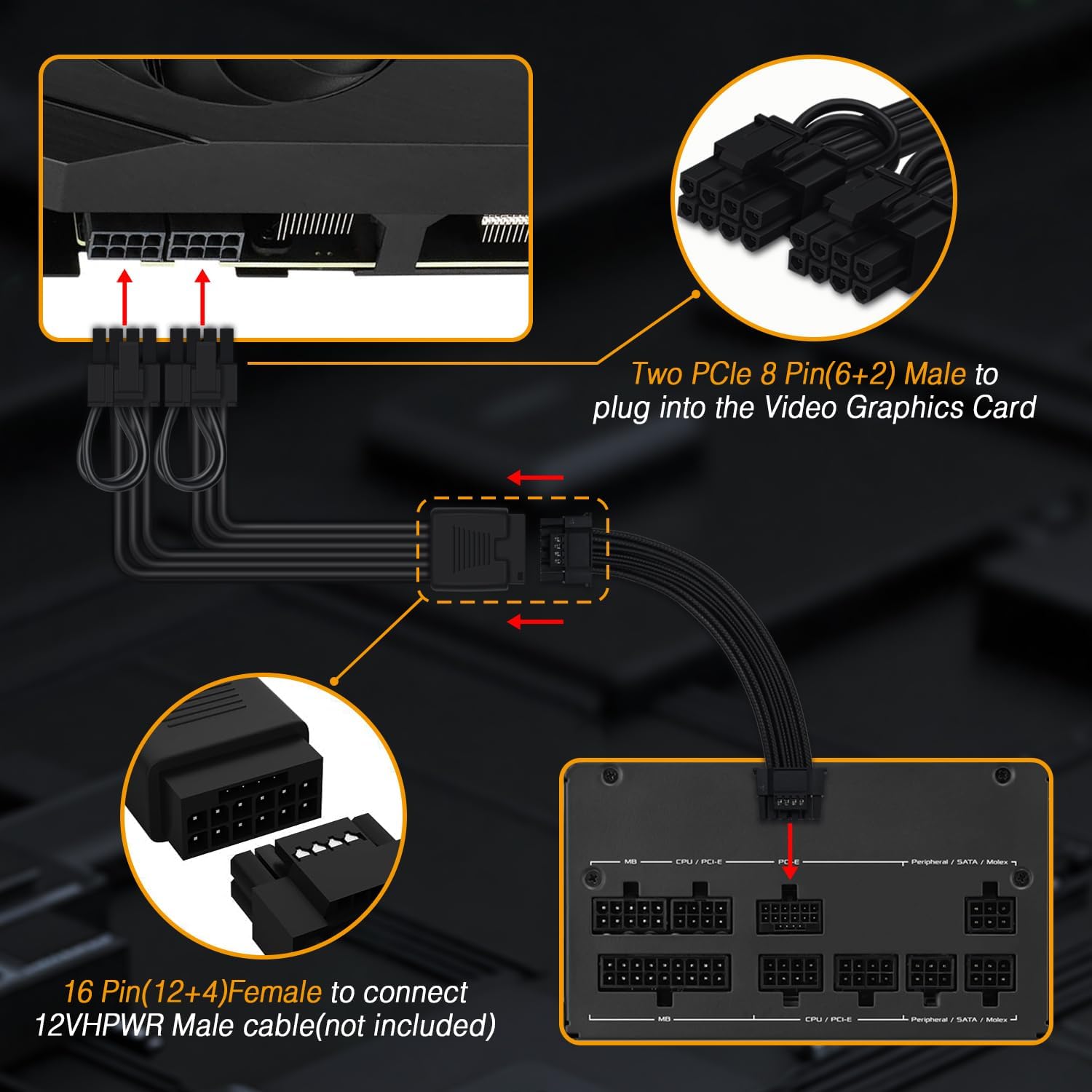12VHPWR Cable Extension:Designed for converting 16pin(12+4) port to dual 8pin(6+2) male port.
