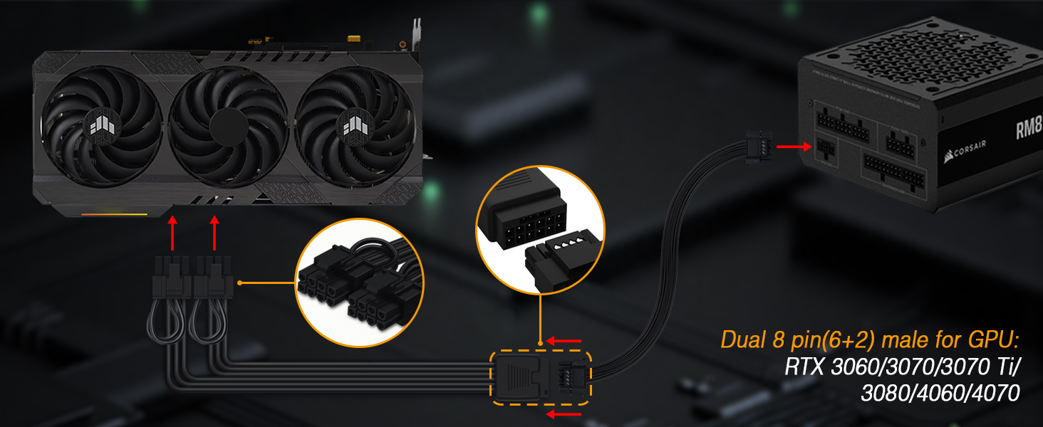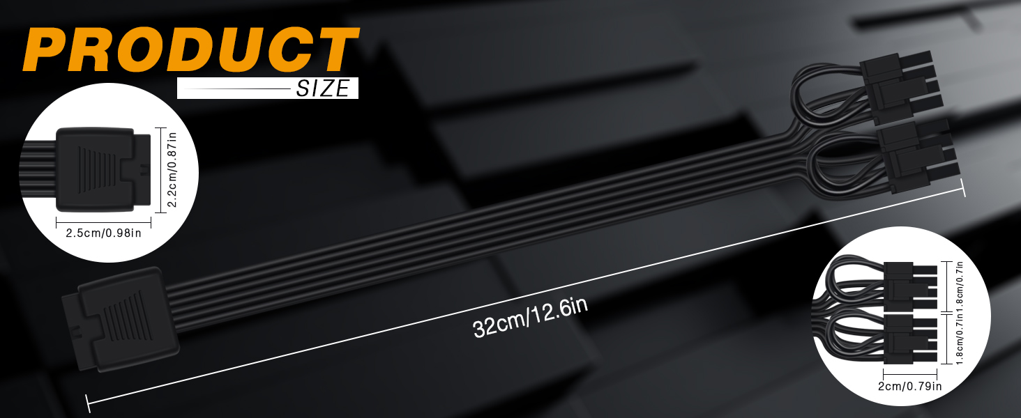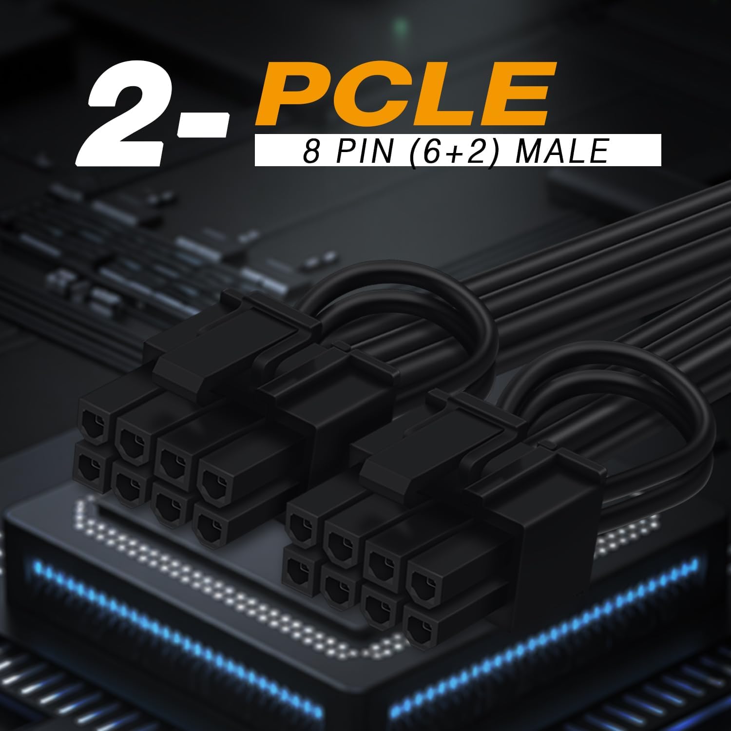 • 16 Pin - Dual 8P(6+2) : 16 Pin(12+4) female end to plug into the PCIe 16 pin output cable of your power supply(Note: This is conversion cable, Not modular cable.) and two PCIe 8 pin(6+2) male ends to plug into the video graphics card.(The 8 pin (6+2) ends could be used as 6 pin or 8 pin end by sliding on/off the 2 pin.);