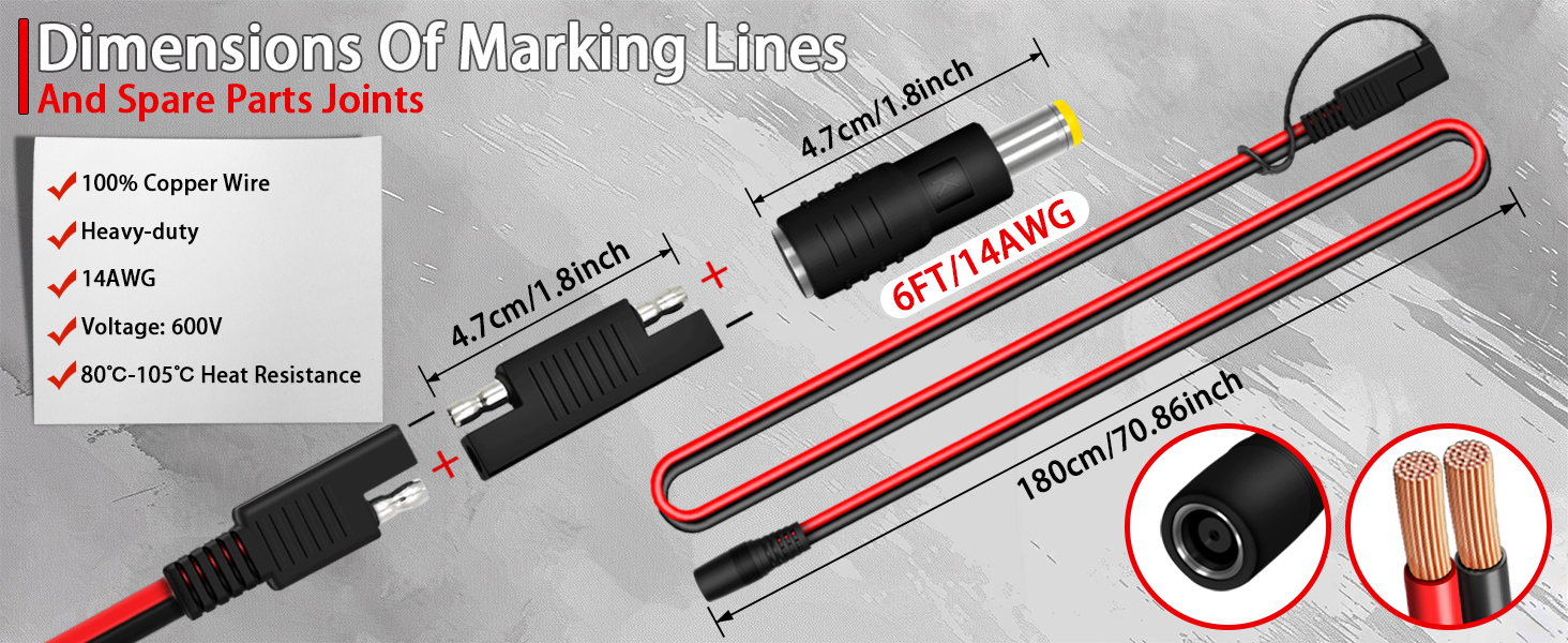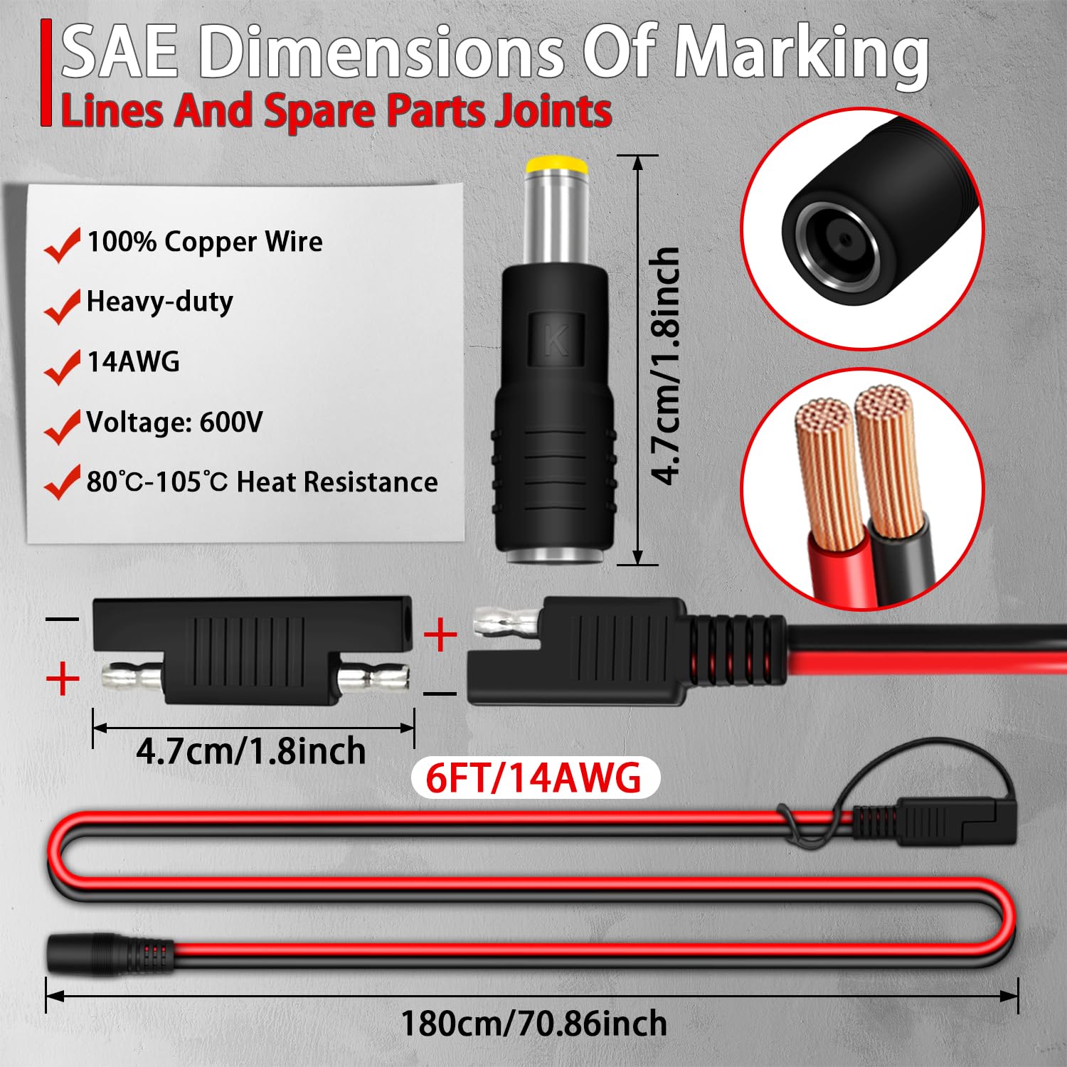 • 『Heavy Duty 14AWG』The heavy duty 14AWG wires are used to provide the stable current for your devices. Double PVC jacket: 80°C heat resistance, Cable Length(including connectors):6ft(1.8m), What You Get:1x SAE to DC 8mm (DC 7.9x0.9mm) Adapter, 1x DC7909 to DC8020 Converter.