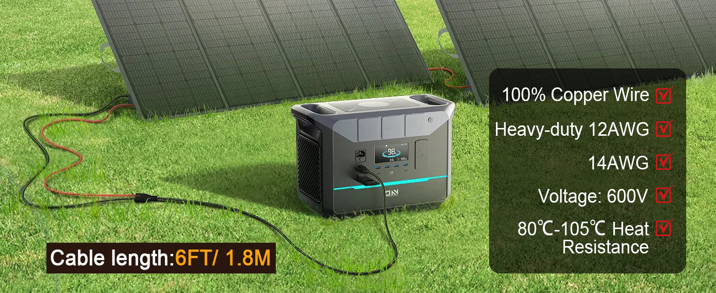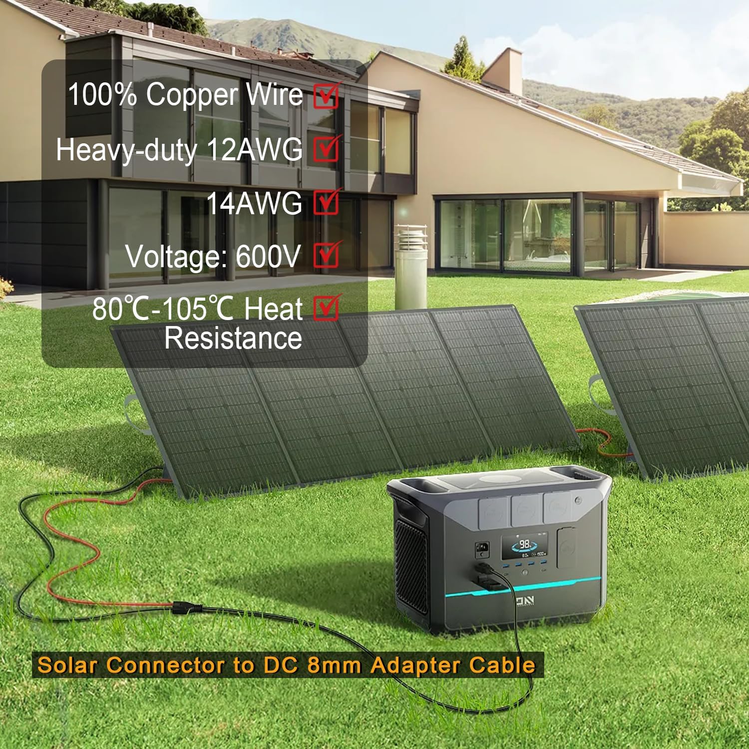 • 『Heavy Duty 12AWG+14AWG』The heavy duty 12AWG+14AWG wires are used to provide the stable current for your devices. Double PVC jacket: 80°C-105 °C heat resistance, Cable Length(including connectors):6ft(1.8m), What You Get:1x MC-4 Solar Connector to DC 8mm (DC 7.9x0.9mm) Adapter, 1x DC5525 Converter, 1x DC8020 Converter.