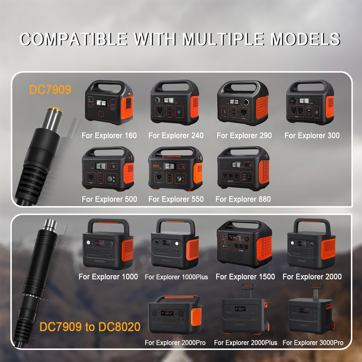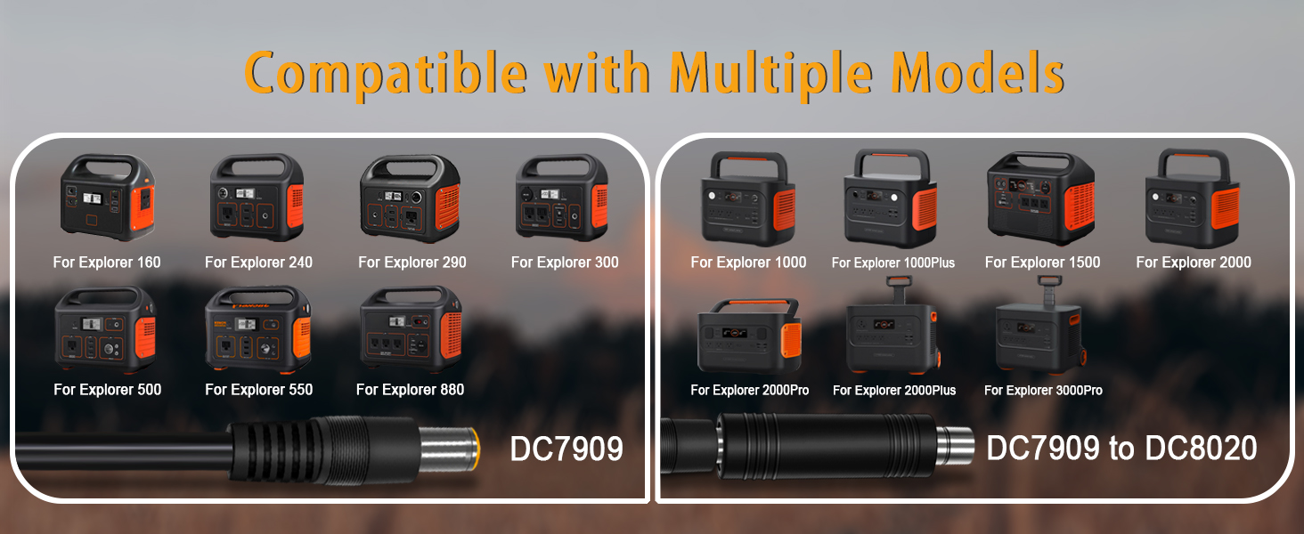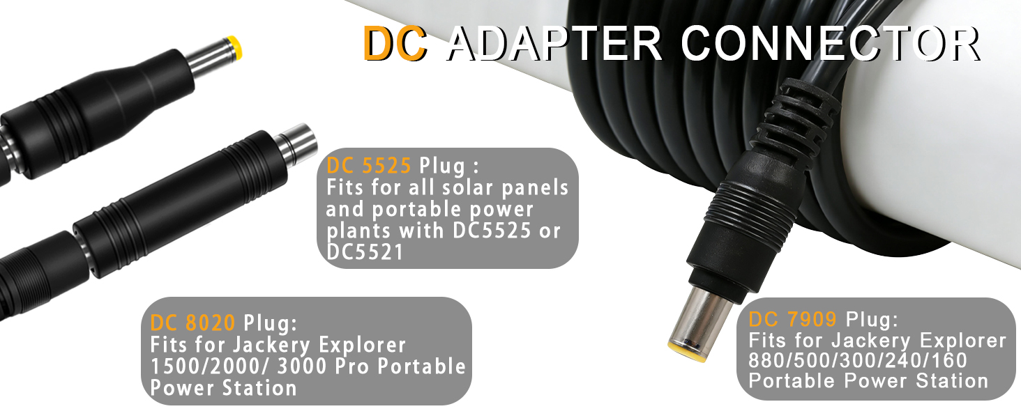 • 『DC7909 to DC8020/DC5525 Connectors』When to use the Jackery Explorer 1500/2000, 300 Plus/600 Plus/1000 Plus/1000 v2/2000 Pro portable power station, please plug the DC7909 to DC8020 connector. When to use the power station with DC5.5*2.5mm port, please plug the DC7909 to DC5525 connector.