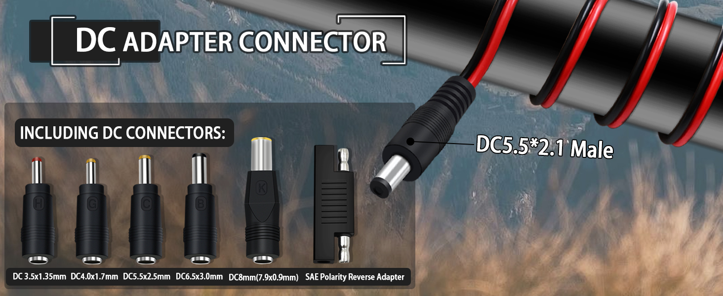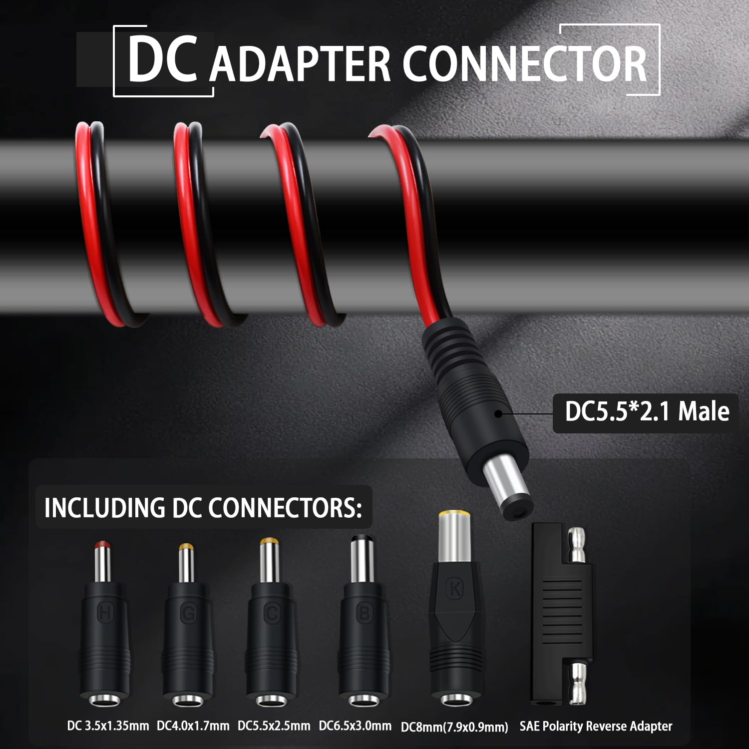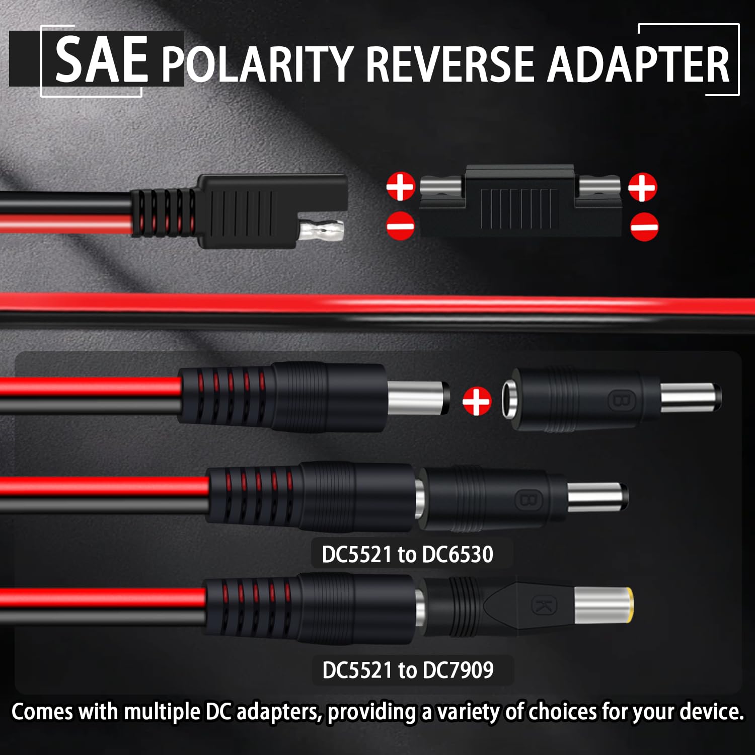 『What You Get』SAE plug with dustproof cap to DC 5.5 x 2.1mm Cable *1pcs, SAE Polarity Reverse Adapter*1pcs, DC Converter Adapters: 1 * DC 8mm(7.9 x 0.9mm) adapter, 1 * DC 6.5 x 3.0mm adapter, 1 * DC 5.5 x 2.5mm adapter, 1 * DC 4.0 x 1.7mmadapter, 1 * DC 3.5 x 1.35mm adapter.