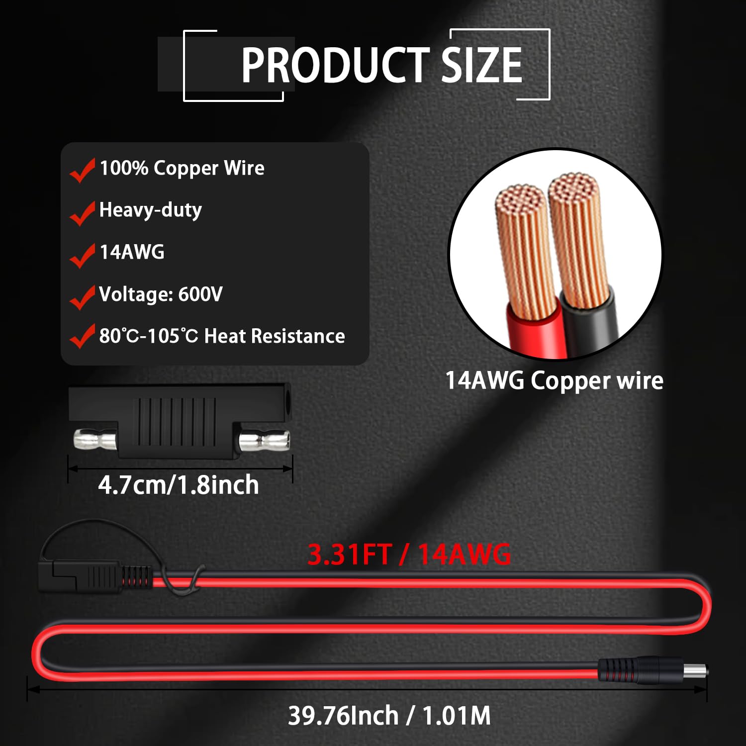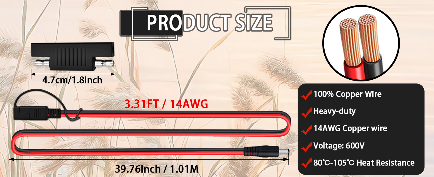 『Parameters』Length(including SAE connector): 3.31ft(1.01m), Gauge: SPT-2 14AWG/2C copper wire, Rated Current-10A,Rated Voltage-12V. The cable works with the 12-24V device with a rated power of 180W or 15A.