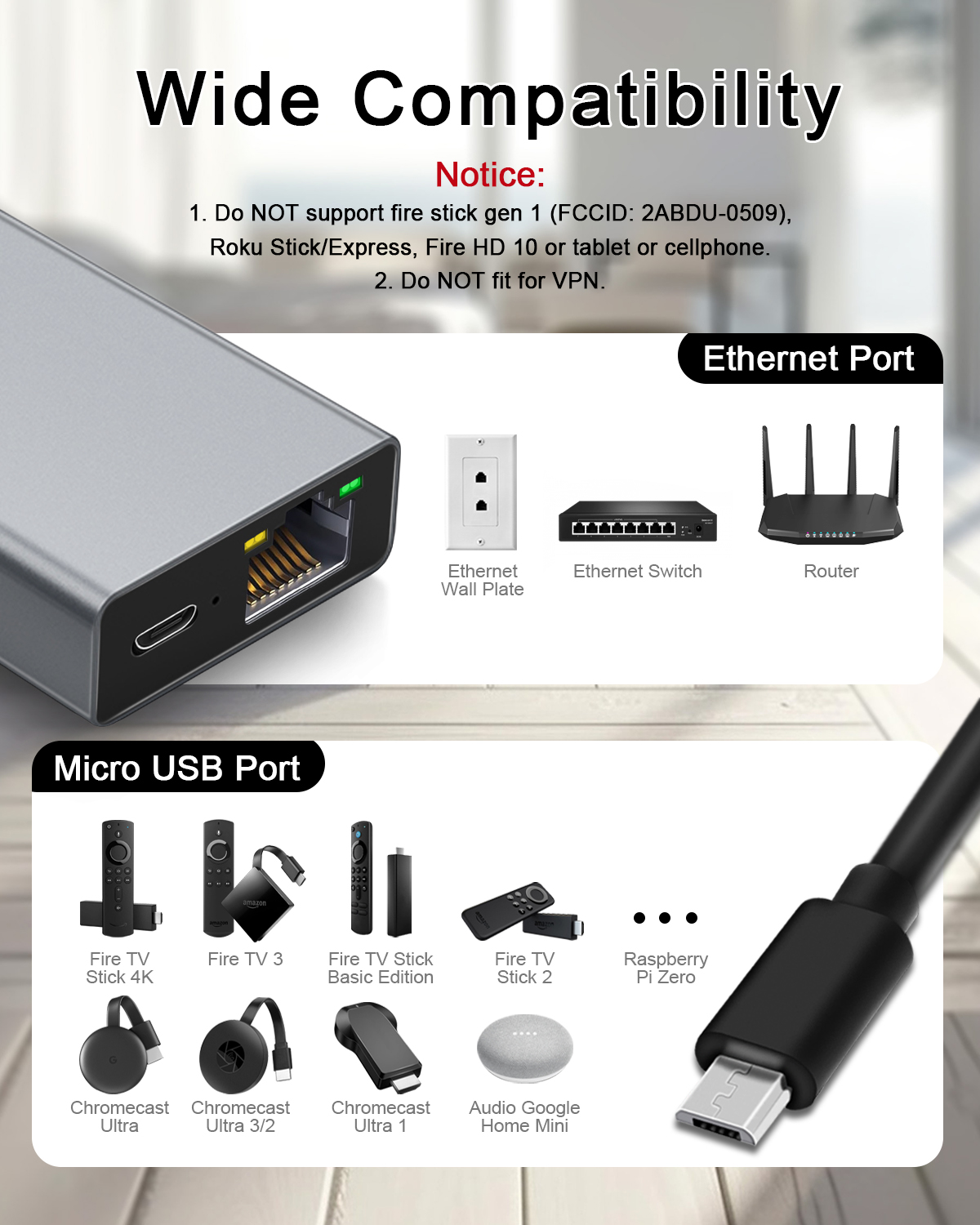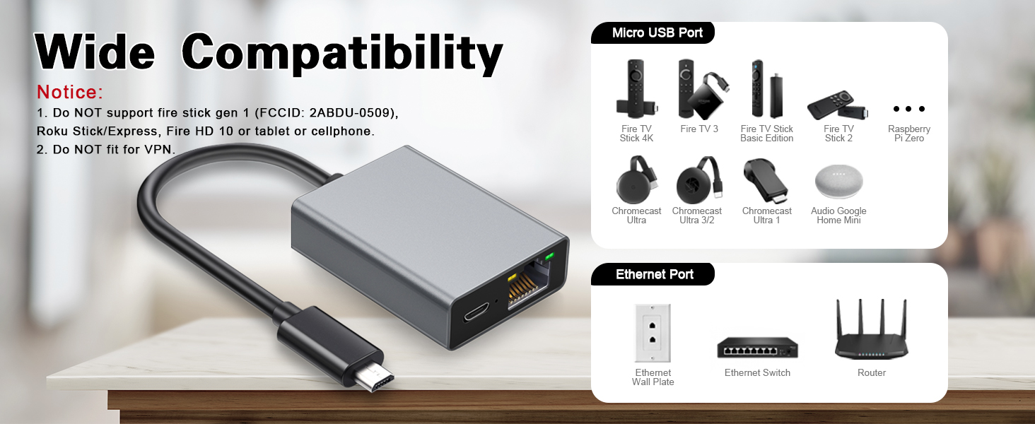 • Pre-Use Instructions - Suitable for Fire Stick TV 4k, Google Home Mini, chromecast ultra audio, etc.NOT compatible with Fire TV stick gen 1, Chromecast with Google TV(HD)/Chromecast with Google TV(4K), roku stick/express, fire HD 10 or tablet or cellphone; Does not fit for VPN.