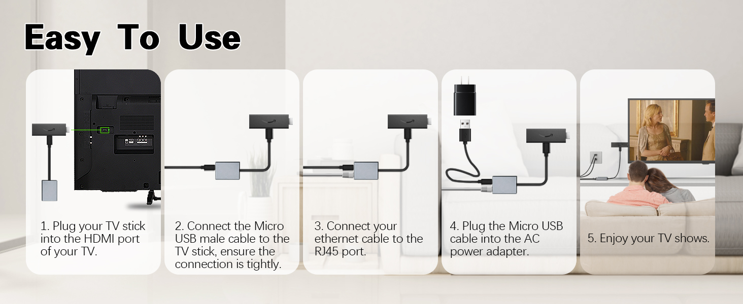 • Ethernet Adapter For TV Stick - Our ethernet adapter is designed specifically for Fire TV sticks. With our Ethernet adapter for the Fire TV stick, the Ethernet cable connector can be directly connected to the TV stick, perfectly solving problems such as unstable wireless network connection, weak signal, and delay Let you enjoy a better visual experience.