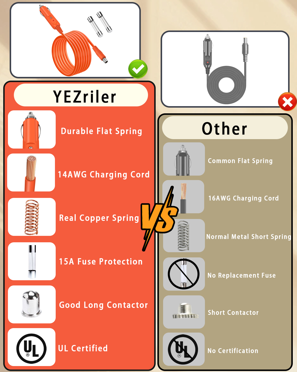 • Specifications & Package Included - Input: 12V to 24V up to 13A; Output: 150W up to 180W; Connector size: 8.0 mm; Wire gauge: 14 AWG heavy duty power cable(UL Certified Wire); Cable Length: 6.6 FT / 2 m; Double PVC Jacket; Product packaging includes 1 x cigarette lighter charging cord, 2 x 15A replacement fuse.