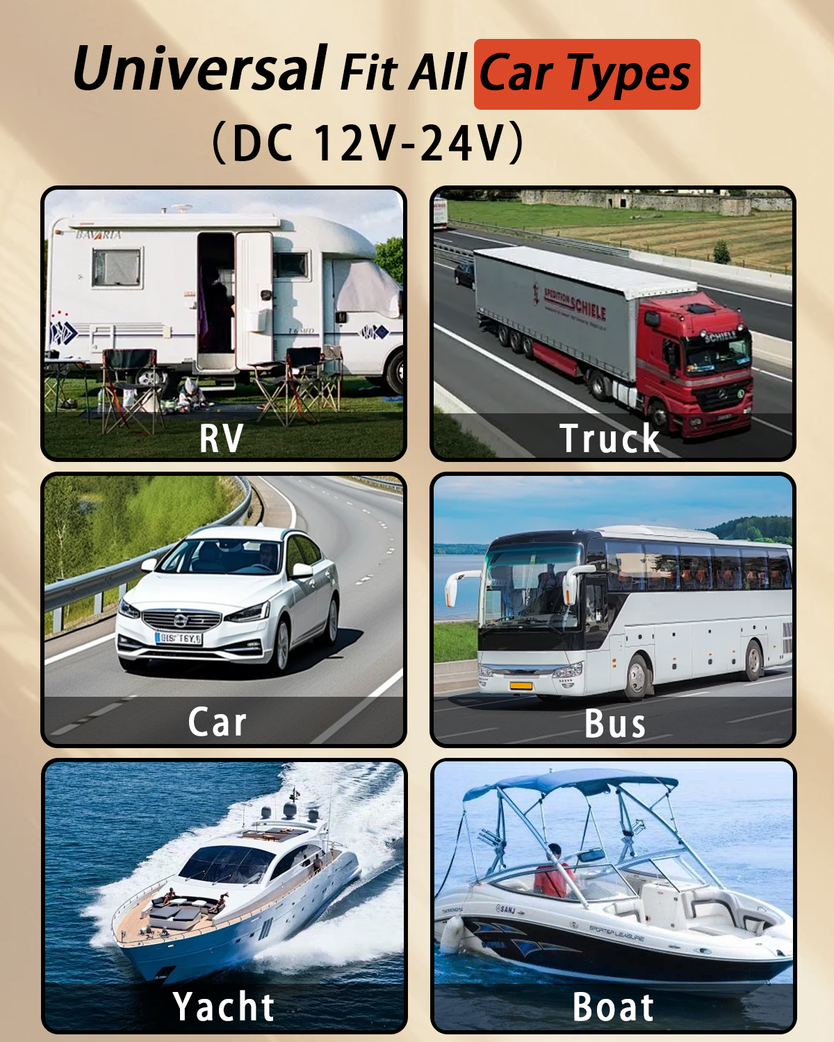 • Widely Used - It can be compatible with most of the vehicles with voltage from 12 to 24V DC. Widely used in cars, trucks, motorhomes, buses, off-road vehicles, ATVs, vans, boats, bicycles, touring caravans, camper vans, and motorbikes.
