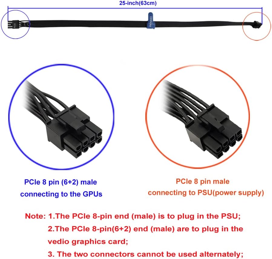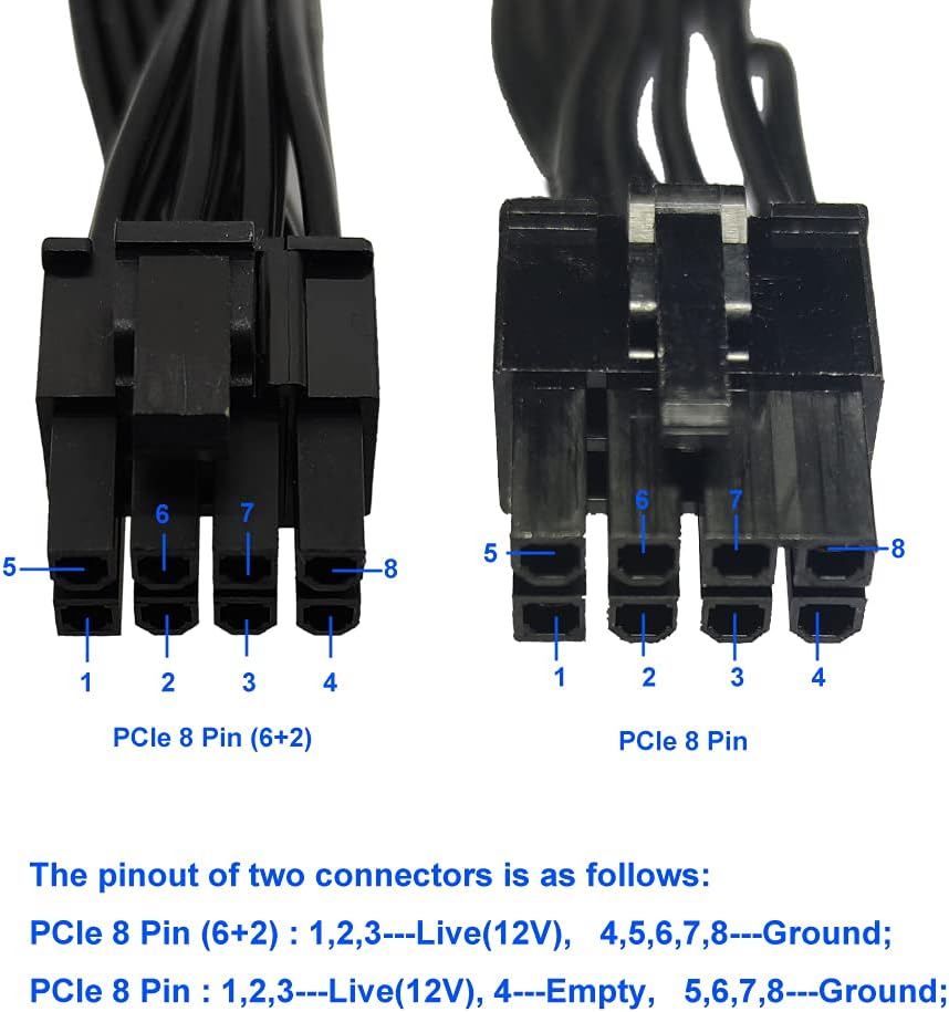 『PCIe 8P - Single 8P(6+2)』:PCIe 8 pin male end to plug into the power supply (NOTE: it is PCIe 8 pin, not CPU 8 pin) and PCIe 8 pin(6+2) male end to plug into the video graphics card.(NOTE: the 8 pin end and 8 pin(6+2) male end cannot be used interchangeably);