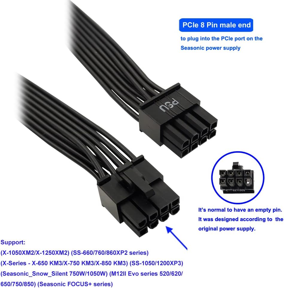 『PCIe Cable for Seasonic PSUs』: Compatible with (X-1050XM2/X-1250XM2),(SS-660/760/860XP2 series),(X-Series - X-650 KM3/X-750 KM3/X-850 KM3),(SS-1050/1200XP3),(Seasonic_Snow_Silent 750W/1050W),(M12II Evo series 520/620/650/750/850),(Seasonic FOCUS+ series), SSR-1000PD/SSR-1200PD, SSR-600TL;