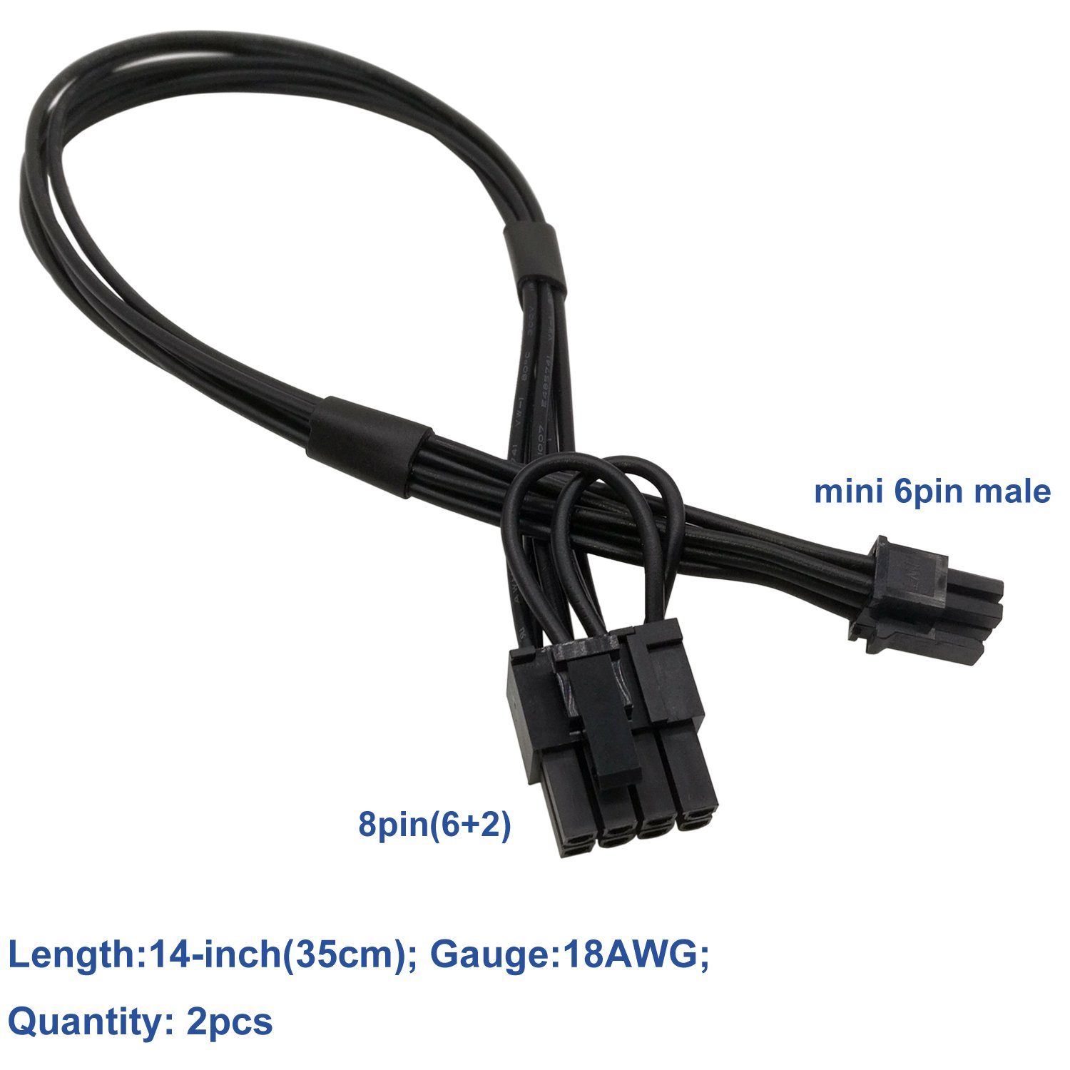 『Mini 6P - Standard 8P(6+2)』Mini 6 pin male end to plug into the Mac motherboard (NOTE: the end is mini 6 pin, not stanard 6 pin size.), Standard 8 pin (6+2) male end to plug into the video graphics card (8 pin (6+2) end could be used as 6 pin or 8 pin end by sliding on/off the 2 pin);