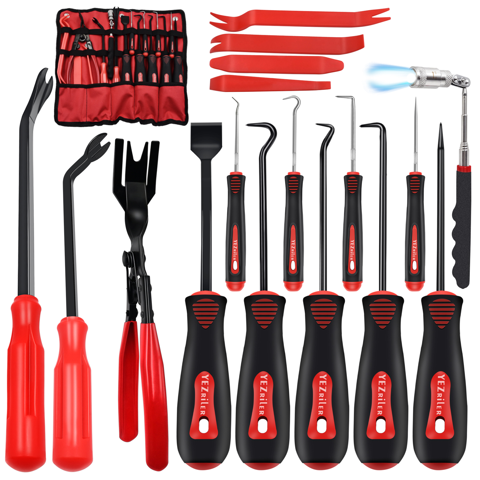17 Pcs Mechanic Hook Pick Tool Set and Auto Trim Removal Tool Kit with Auto Clip Plier Rivets Puller Telescoping Magnetic Pickup Gasket Scraper for Remove Automotive Hand Pick Up Tools
