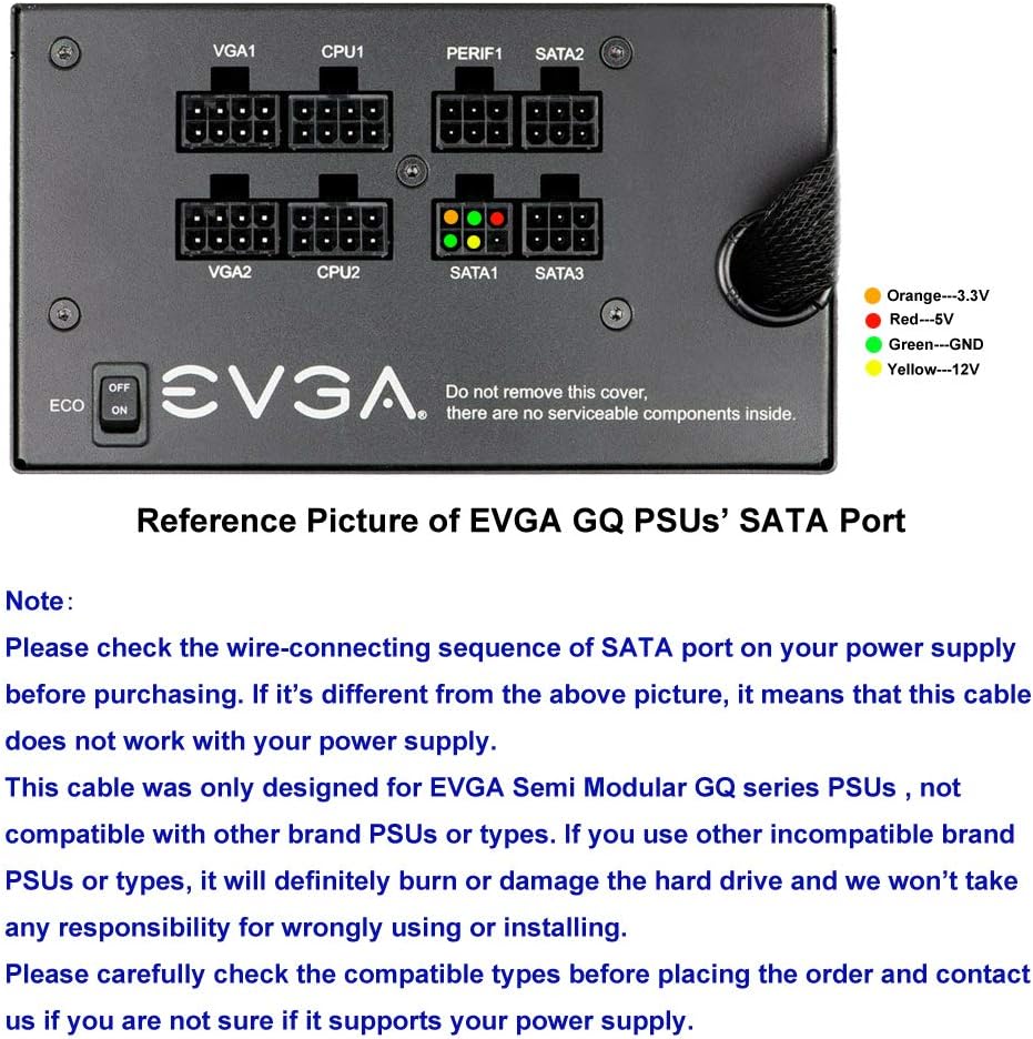 『Note』This cable was only designed for EVGA Semi Modular GQ series PSUs listed in the 1st point, not compatible with other brand PSUs or types. If you use other incompatible PSUs, it will definitely burn or damage the hard drive and we won’t take any responsibility for wrongly using or installing. Please carefully check the compatible types or contact us if you are not sure if it supports your power supply;