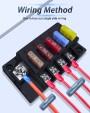 - Compact 12V Fuse Block - This optimized version of the fuse box through the use of stud unidirectional positive input one into four out of the single side of the wiring, wiring can be more simple. At the same time compared to the traditional fuse box, the size is more small, and will not take up too much space. In addition, it is equipped with a spare slot, which is convenient for users to replace the fuse at any time when it is blown.