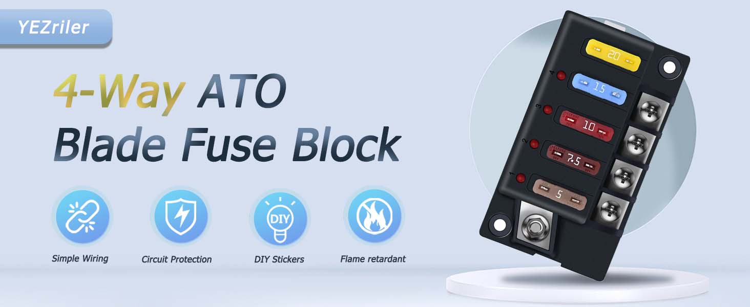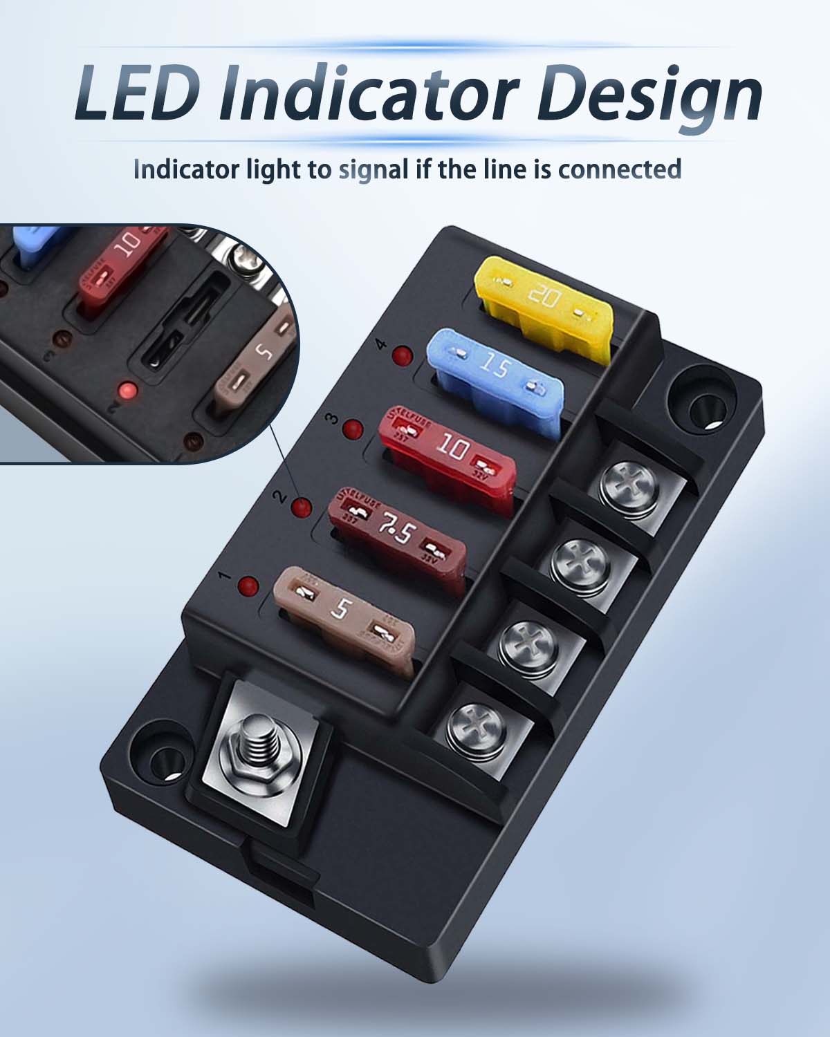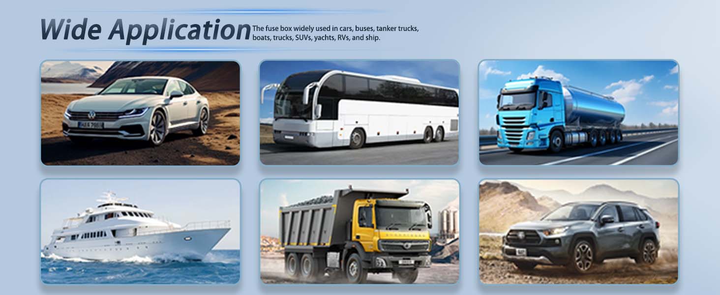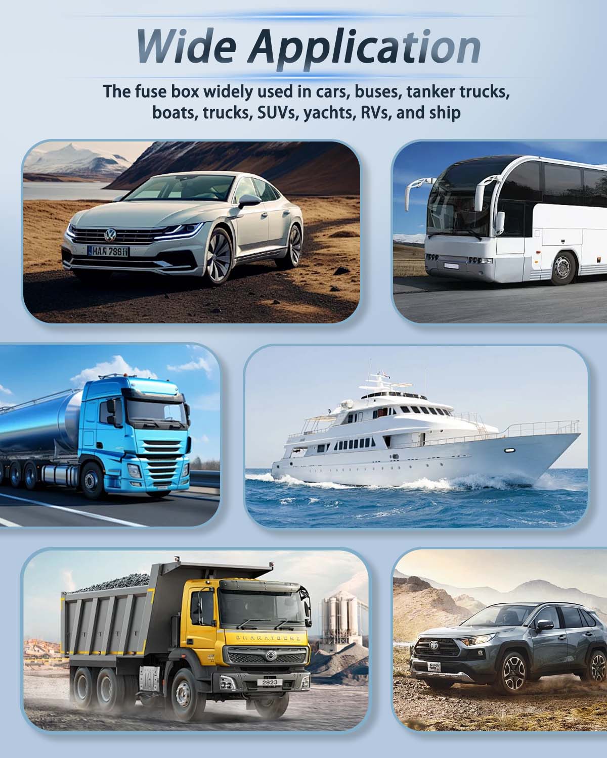 - APPLICATIONS - This 4-circuit fuse box is widely used in cars, trucks, boats, tankers, ships, SUVs, yachts, RVs, vans, boats, and more. Each fuse of the fuse box can be connected to any appliance circuit. For example car dome lights, car headlights, wide lights, fog lights, warning lights, car refrigerators, car chargers and car fans, car TVs, etc.