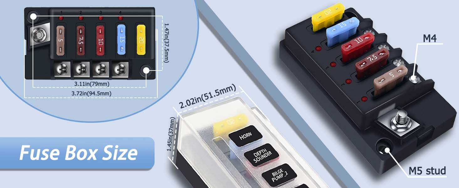 - Package Included - 1 x 4-way blade fuse box with protective cover, 1 x 5A fuse, 1 x 7.5A fuse, 1 x 10A fuse, 1 x 15A fuse, 1 x 20A fuse, 2 x screws, 2 x stickers. If you have any questions about this fuse box holder, please contact us. Our customer service team is always at your service.