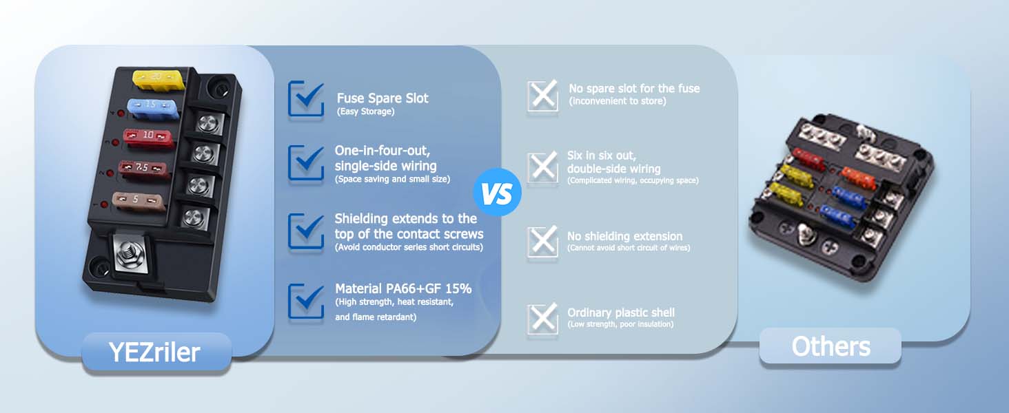 - Durable & Flame Retardant - The main material of our blade fuse box is PA66 + GF15%, and the contact terminals are made of nickel-plated copper, which is stronger and more durable. Meanwhile, the fuse box has high mechanical strength, good insulation, heat resistance, and flame retardant, and the flame retardant has reached the UL94V-0 flame retardant test standard. and the top cover is made of PC material, and the shielding layer extends to the top of contact screws, which avoids a series of short-circuiting phenomena caused by the conductor falling on the metal.