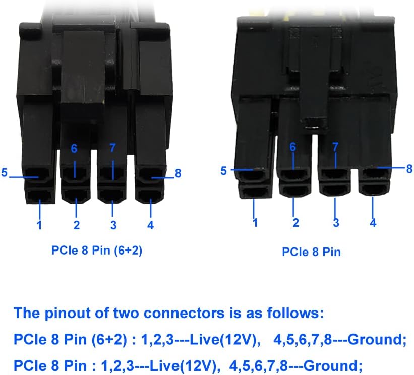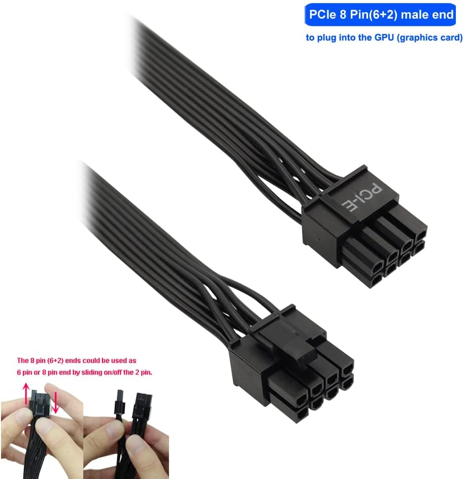 『PCIe 8P - Single 8P(6+2)』:PCIe 8 pin male end to plug into the power supply(Please make sure that the 8 pin port on your power supply is pcie 8 pin port , not cpu 8 pin port when to buy it.) and 8 pin(6+2) male end to plug into the video graphics card.(NOTE: the 8 pin end and 8 pin(6+2) male ends cannot be used interchangeably);