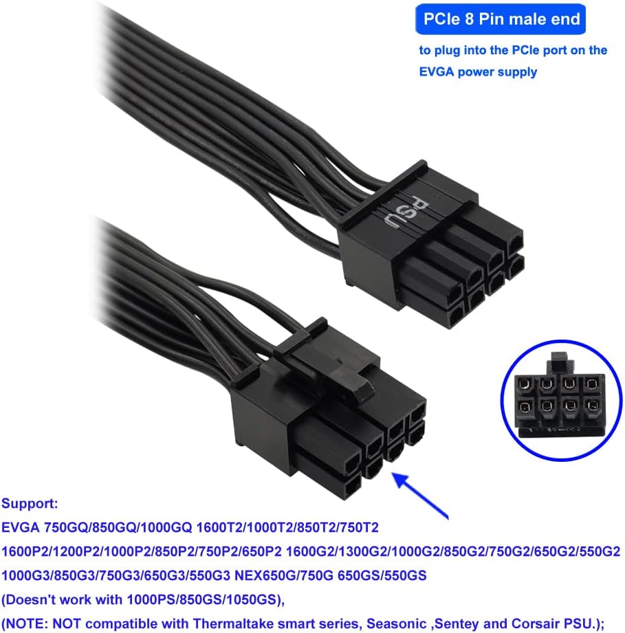『Compatibility』: Compatible with Silverstone, EVGA 750GQ/850GQ/1000GQ 1600T2/1000T2/850T2/750T2 1600P2/1200P2/1000P2/850P2/750P2/650P2 1600G2/1300G2/1000G2/850G2/750G2/650G2/550G2 1000G3/850G3/750G3/650G3/550G3 NEX650G/750G 650GS/550GS(Doesn't work with 1000PS/850GS/1050GS), some types of Thermaltake & COUGAR PSU with 8 pin PCIe port.(NOTE: NOT Compatible with Corsair Power Supply.);