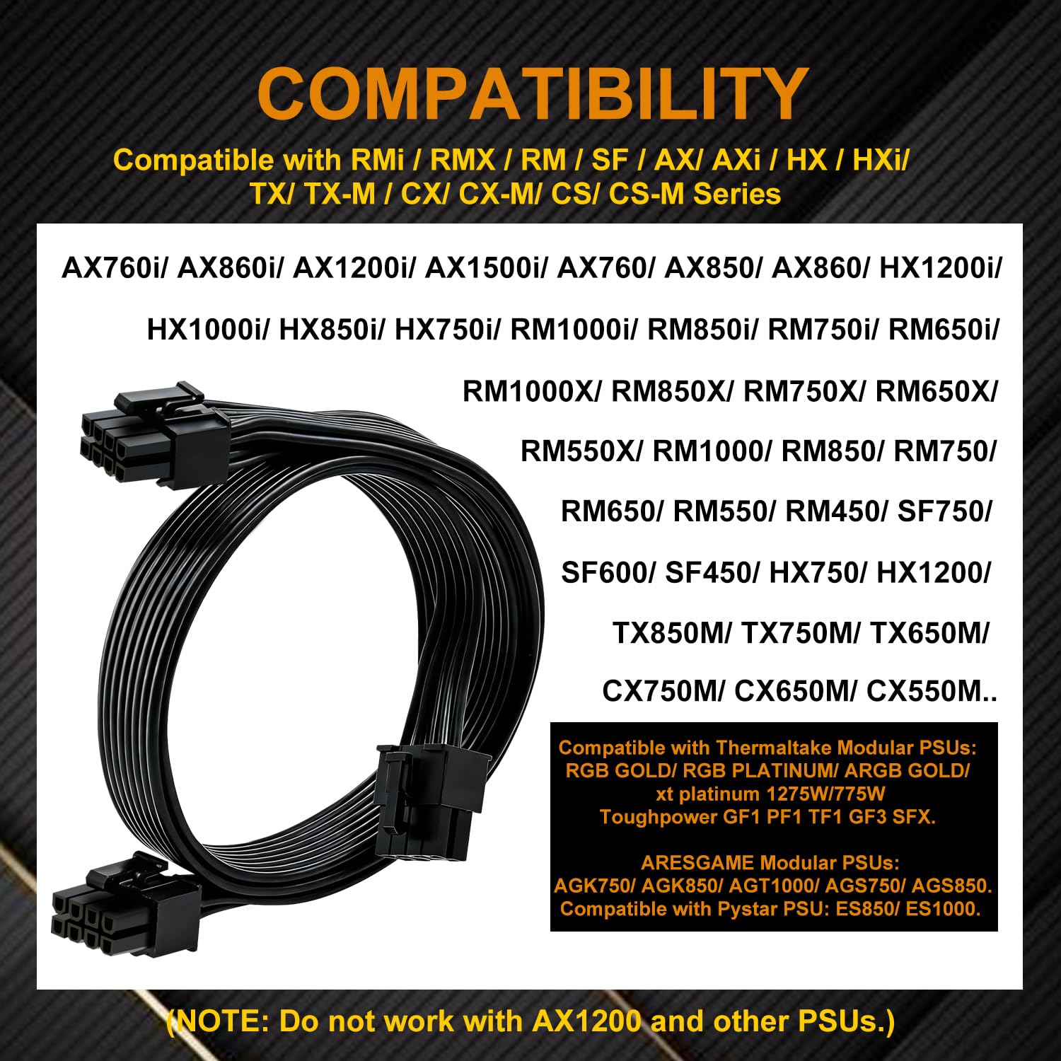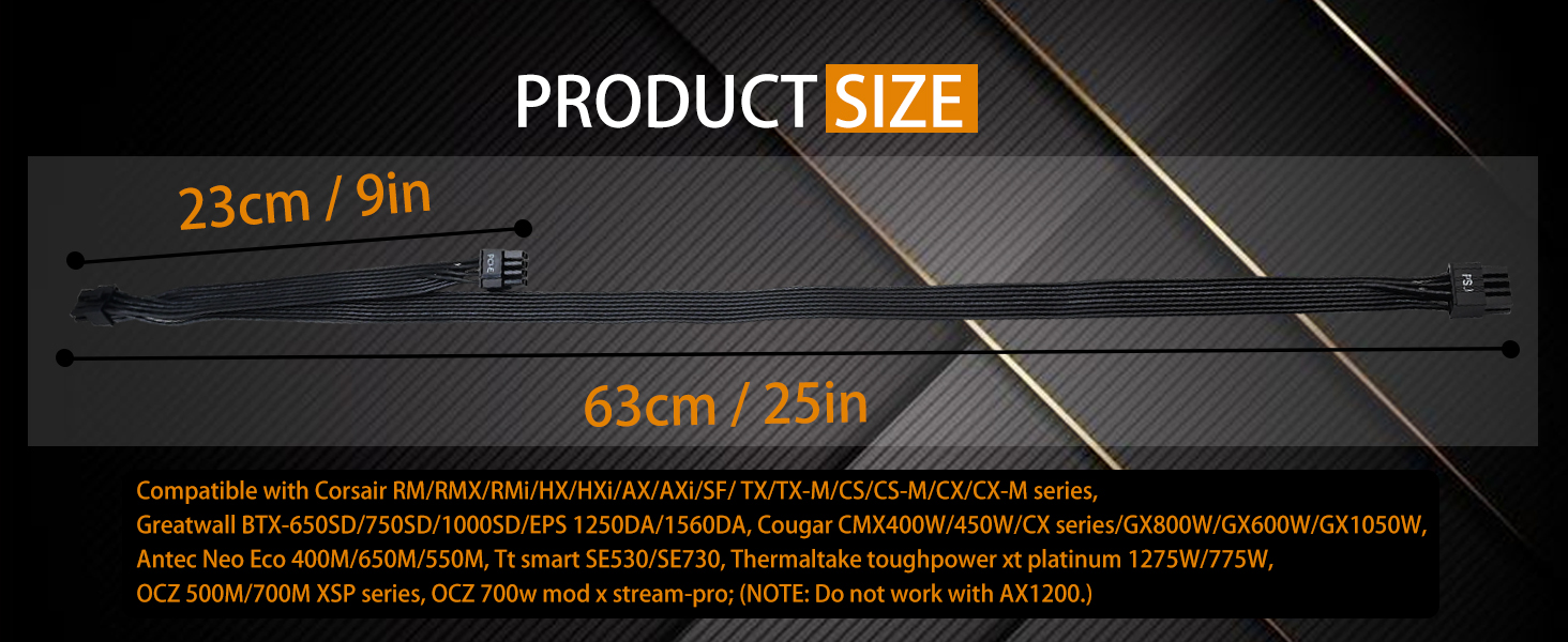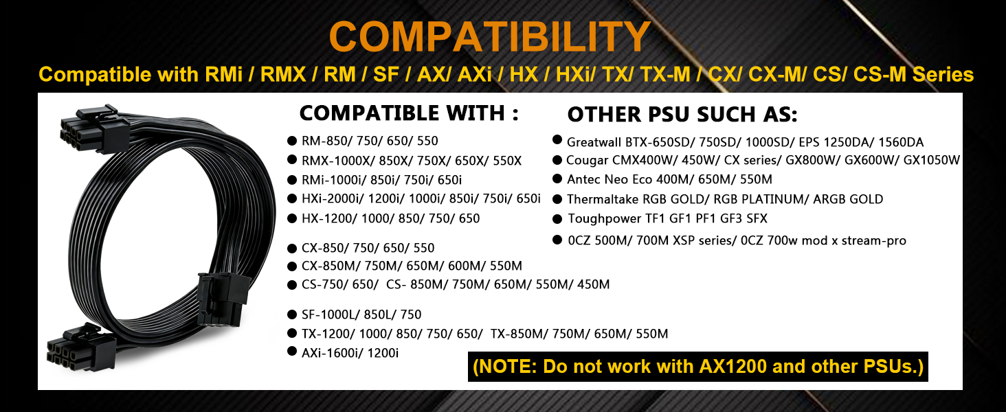 『Compatibility』ONLY compatible with Corsair RM/RMX/RMi/HX/HXi/AX/AXi/SF/TX/TX-M/CS/CS-M/CX/CX-M series,Greatwall BTX-650SD/750SD/1000SD/EPS 1250DA/1560DA, Cougar CMX400W/450W/CX series/GX800W/GX600W/GX1050W,Antec Neo Eco 400M/650M/550M, Tt smart SE530/SE730, Thermaltake toughpower xt platinum 1275W/775W, OCZ 500M/700M XSP series, OCZ 700w mod x stream-pro;(NOTE: Do not work with AX1200.)