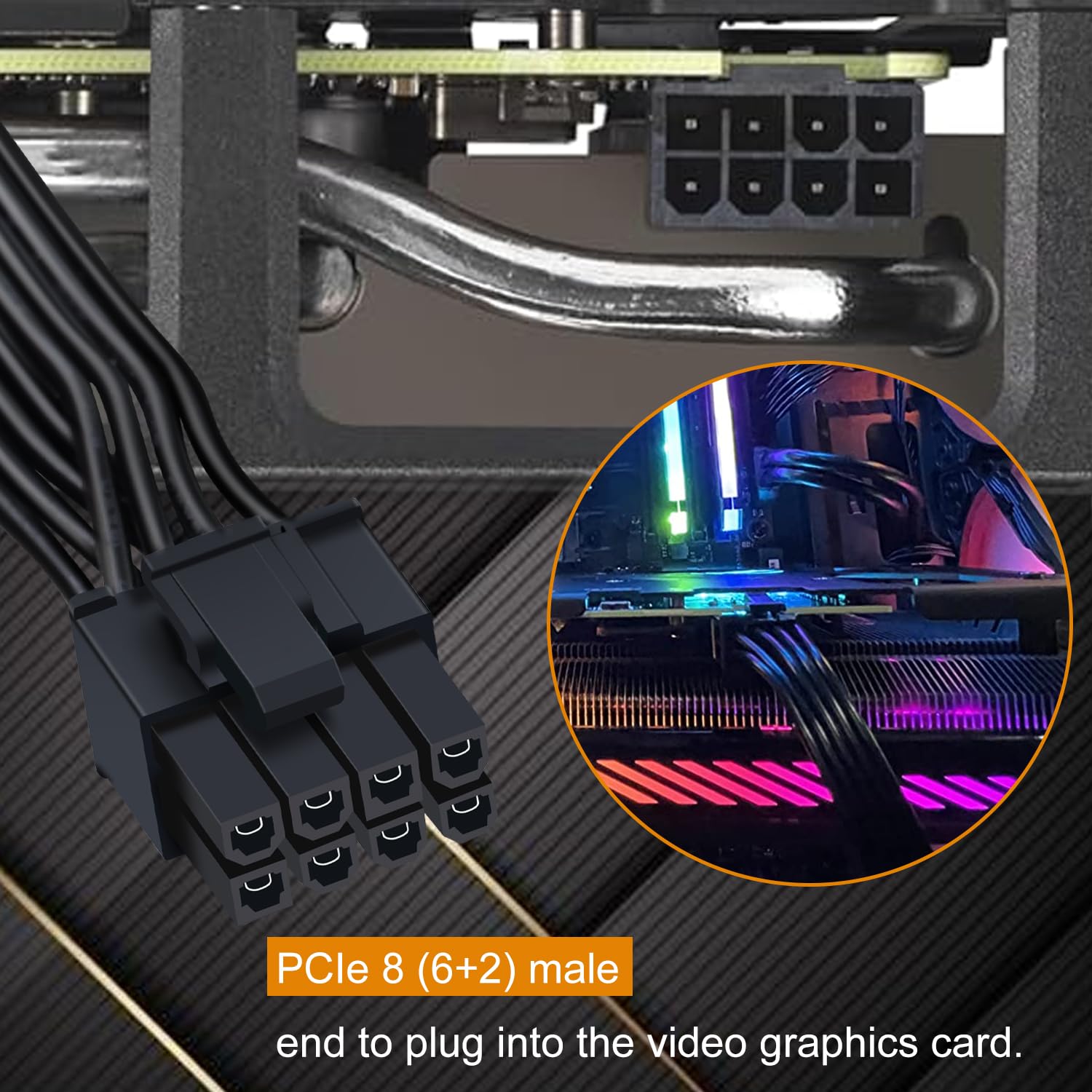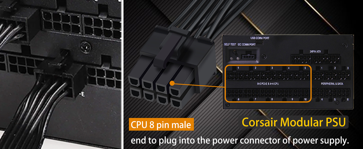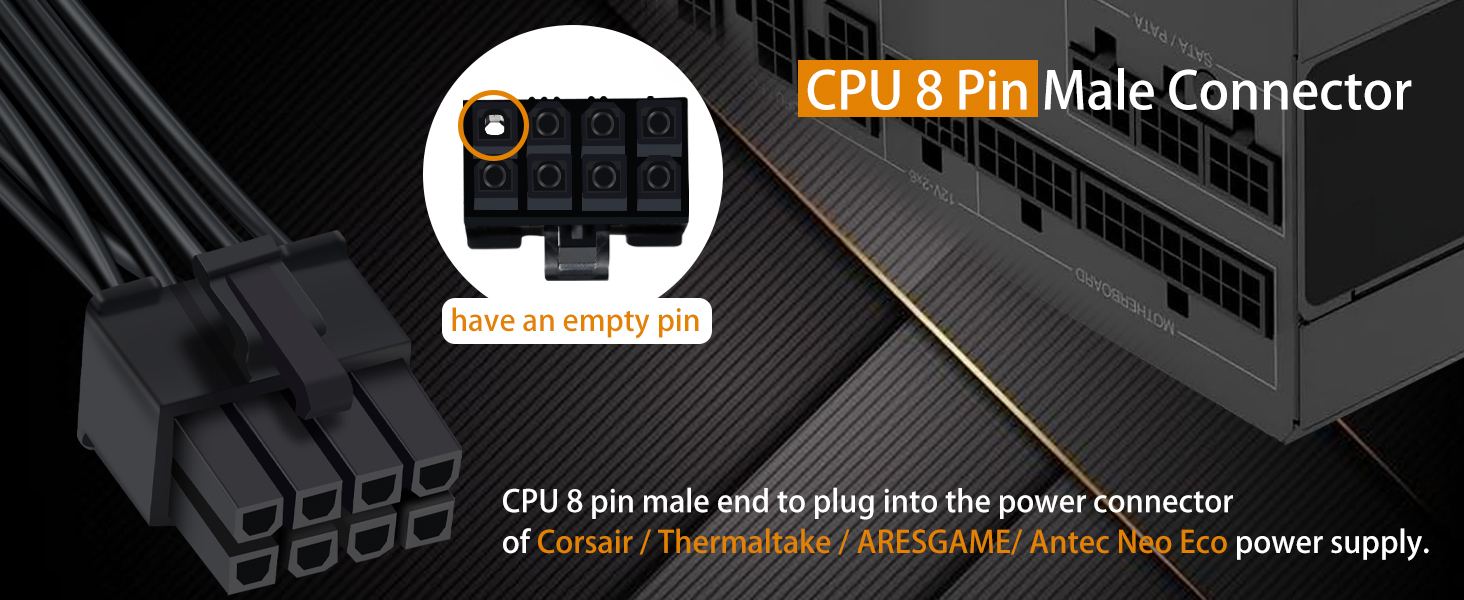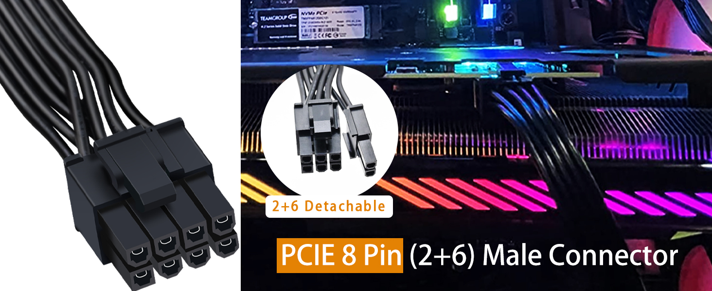 『CPU 8P - Dual 8P(6+2)』ATX 8 pin male end to connect to the power supply (NOTE: 8 pin male connector is ATX 8 pin, not pci-e 8 pin.) and two PCIe 8 pin(6+2) male ends to plug into the video graphics card.(NOTE: the 8 pin end and two 8 pin(6+2) male ends cannot be used interchangeably);