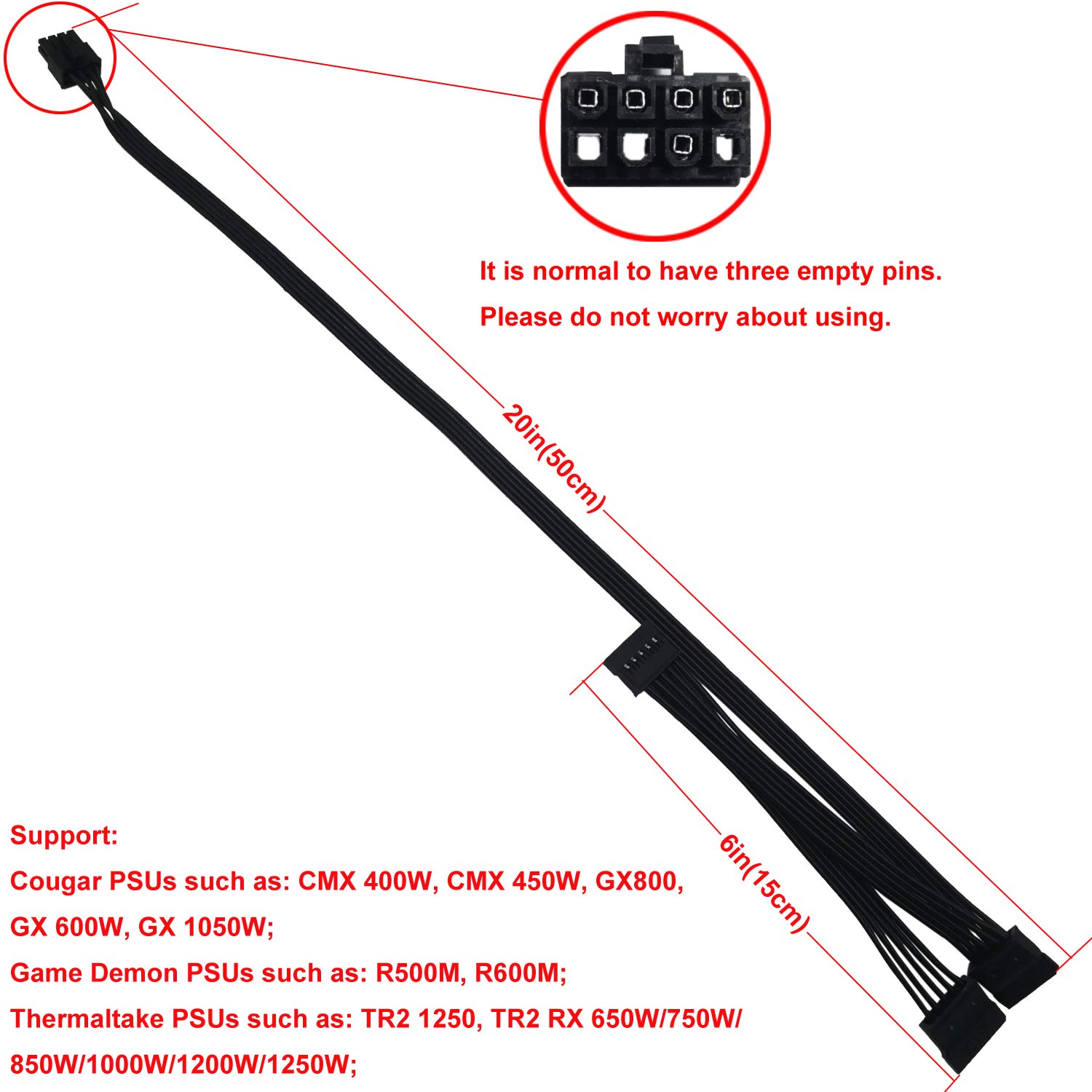 『Parameter』(only for some types of Cougar Thermaltake Game Demon PSU as listed) Gauge: 1007-18AWG(standard tin-coating copper wire), Length(including connectors): main 20inches(50cm)+secondary 6inches(15cm)+thridary 6inches(15cm) ,Between 2 SATA: 6 inches(15cm), Quantity: 1pcs, Self-adhesive tape*1pcs;