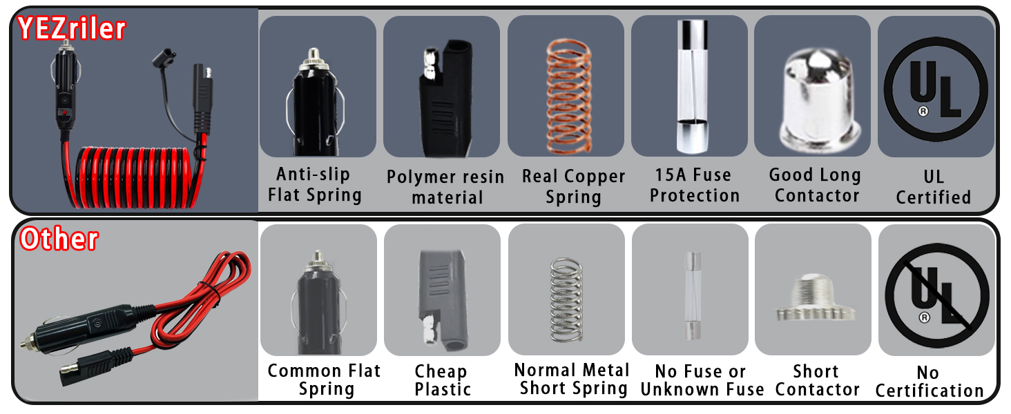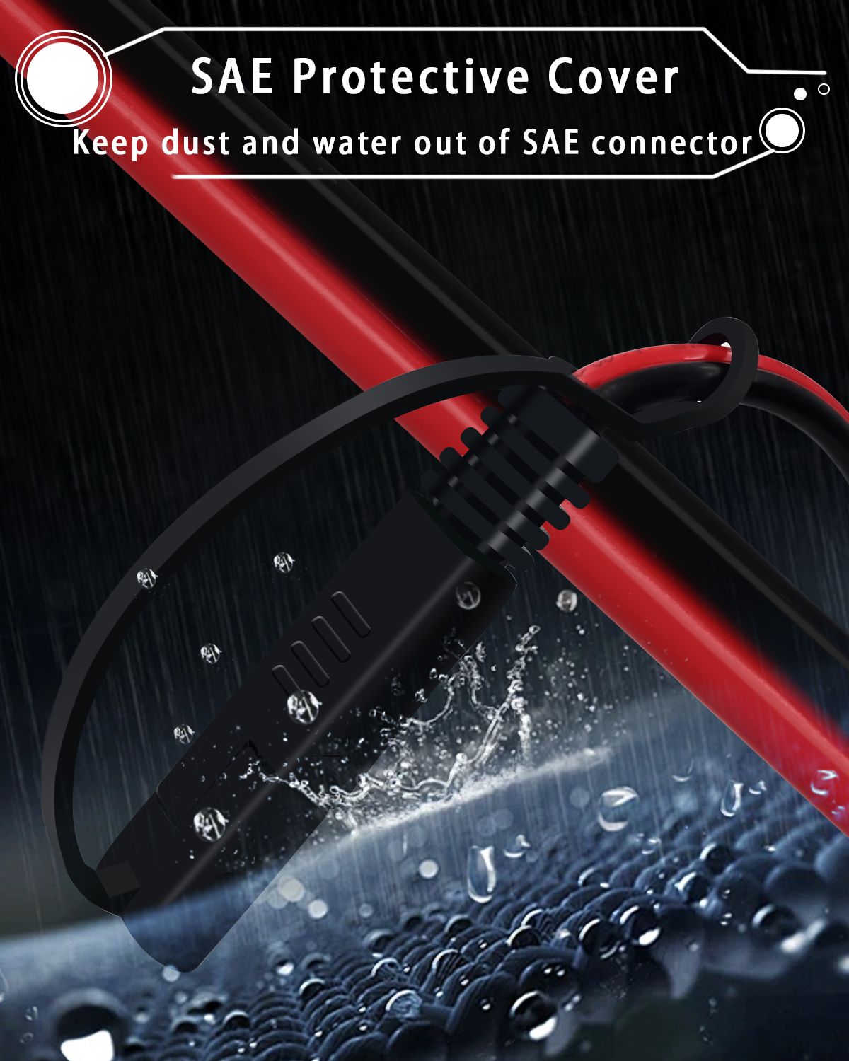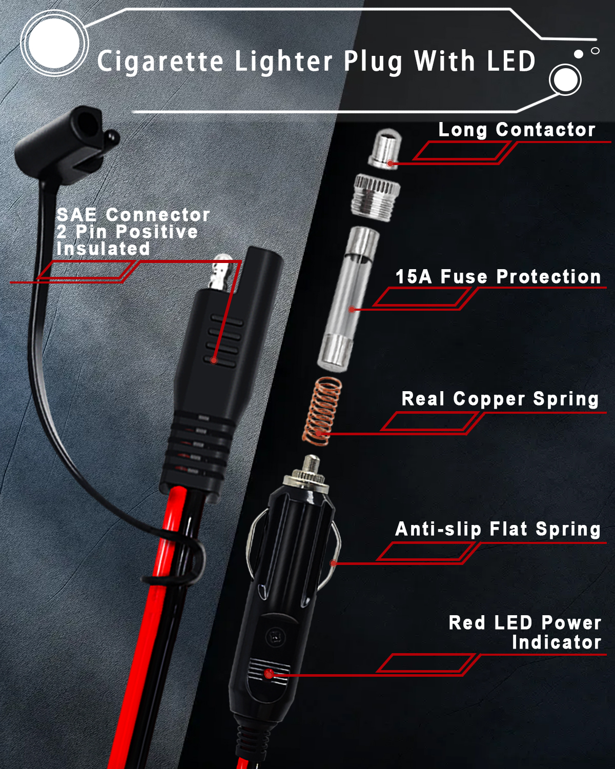 - Safety Protection - The cigarette lighter plug features a red LED indicator that clearly shows if the current is on. A built-in 15A fuse protects the plug from overcurrent and short circuits. A waterproof cover protects the SAE connector from rain and dust.