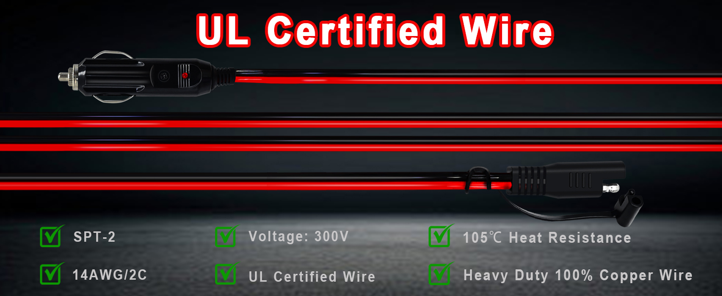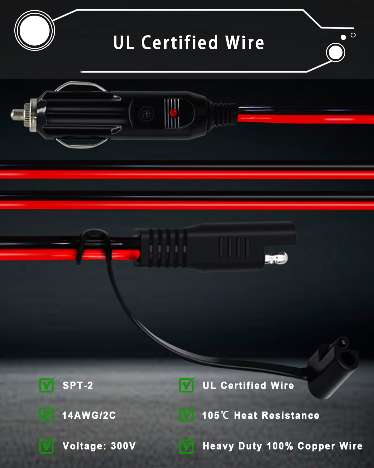 - Specifications - Male Cigarette Lighter Plug to SAE Battery Charger Cable, Voltage: 12-24V; Current: 15A Fuse, Cable Length: 10 Feet, SPT-2 2/C 14AWG(2.08mm) (UL Certified Wire), Double PVC Jacket, 105°C Heat Resistance.