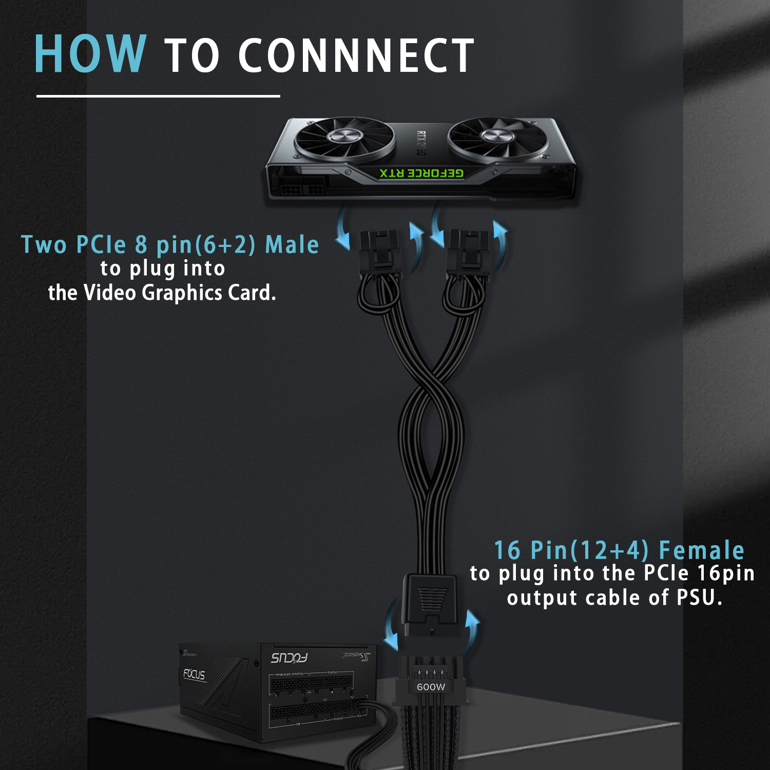 『16 Pin - Dual 8P(6+2)』16 Pin(12+4) female end to plug into the PCIe 16 pin output cable of your power supply(Note: This is conversion cable, Not modular cable.) and two PCIe 8 pin(6+2) male ends to plug into the video graphics card.(The 8 pin (6+2) ends could be used as 6 pin or 8 pin end by sliding on/off the 2 pin.);