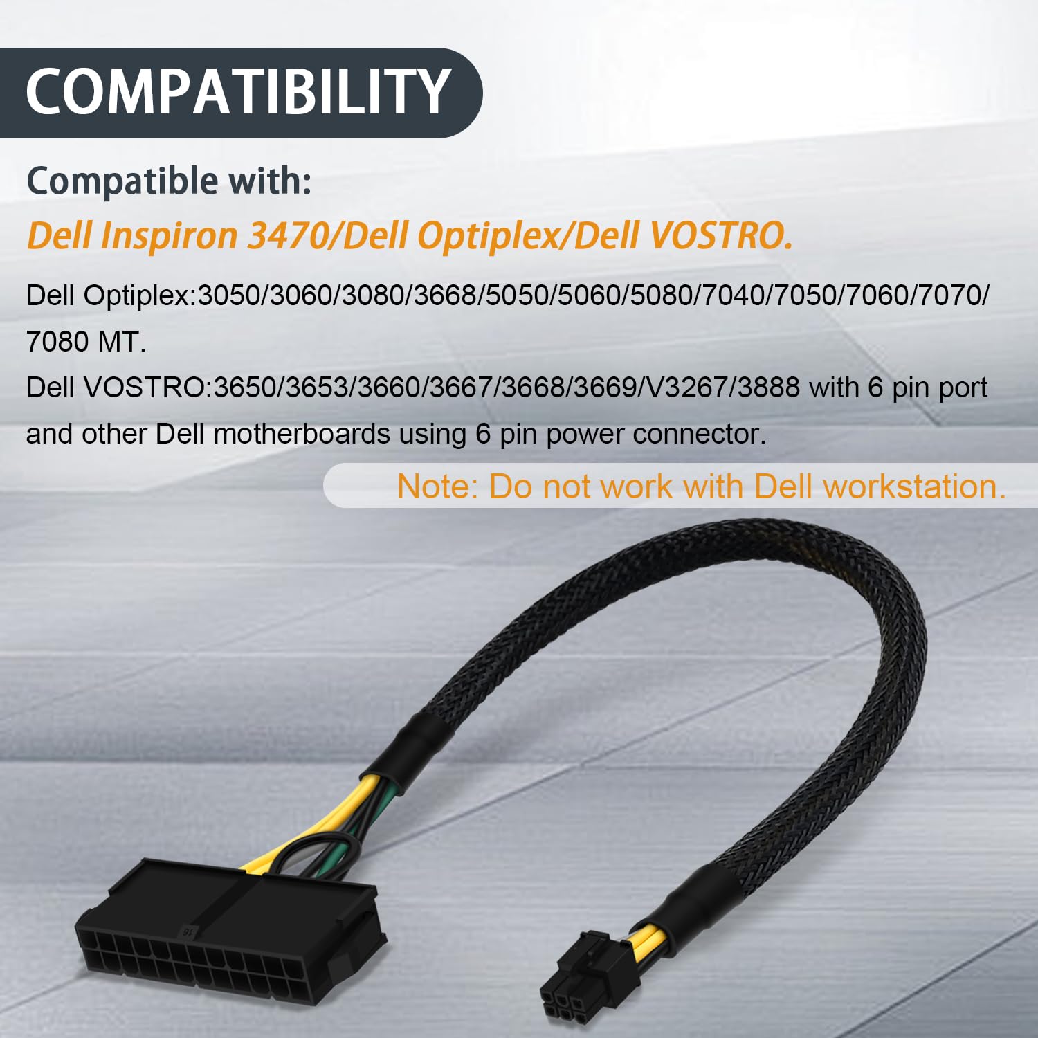 『Compatibility』Compatible with Dell Inspiron 3470,Dell Optiplex 3050/3060/3080/3668/5050/5060/5080/7040/7050/7060/7070/7080 MT, Dell VOSTRO 3650/3653/3660/3667/3668/3669/V3267/3888 with 6 pin port and other Dell motherboards using 6 pin power connector (Note: Do not work with Dell workstation.);