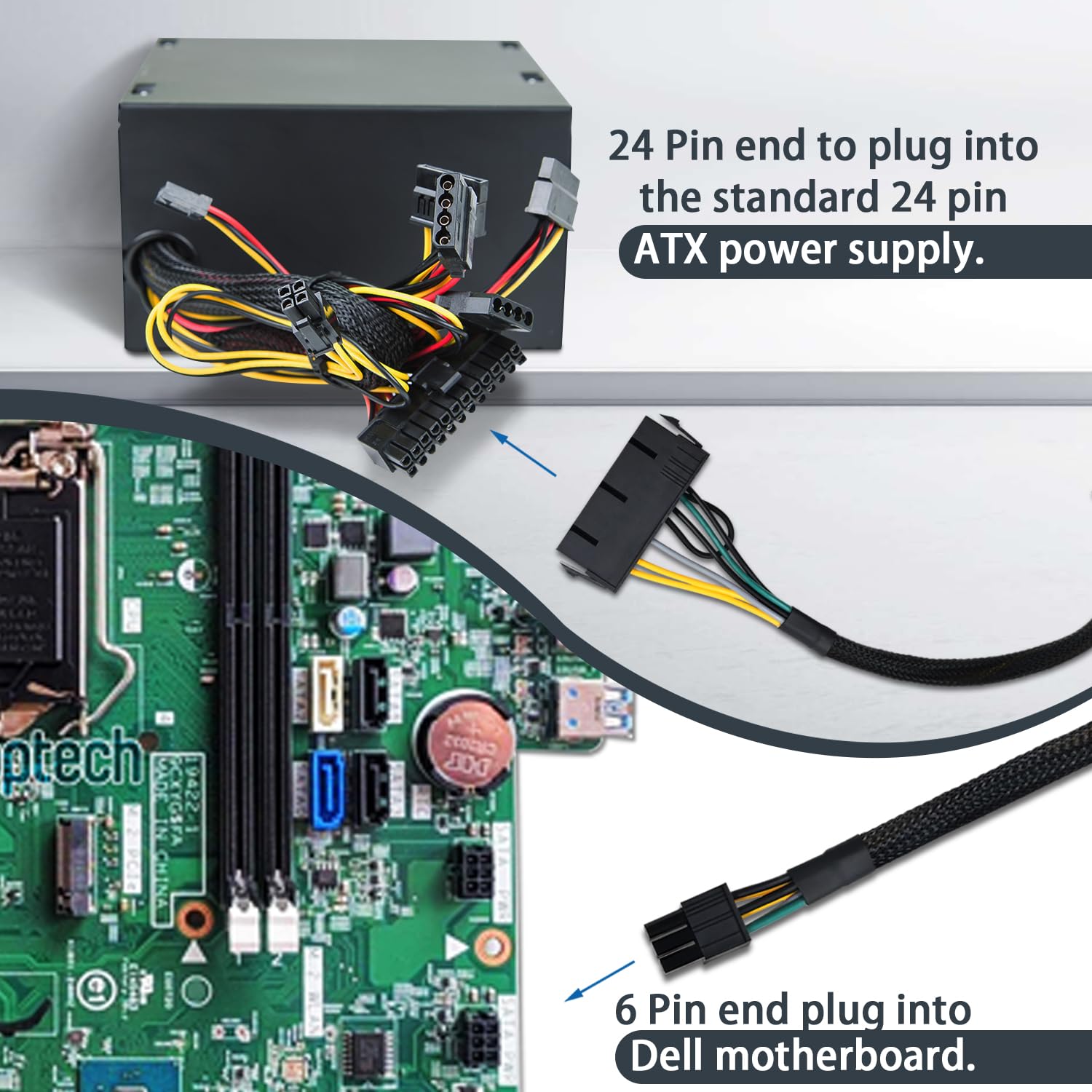 『24P - 6P』24 Pin end to plug into the standard 24 pin ATX Power Supply,6 Pin end plug into Dell motherboard;