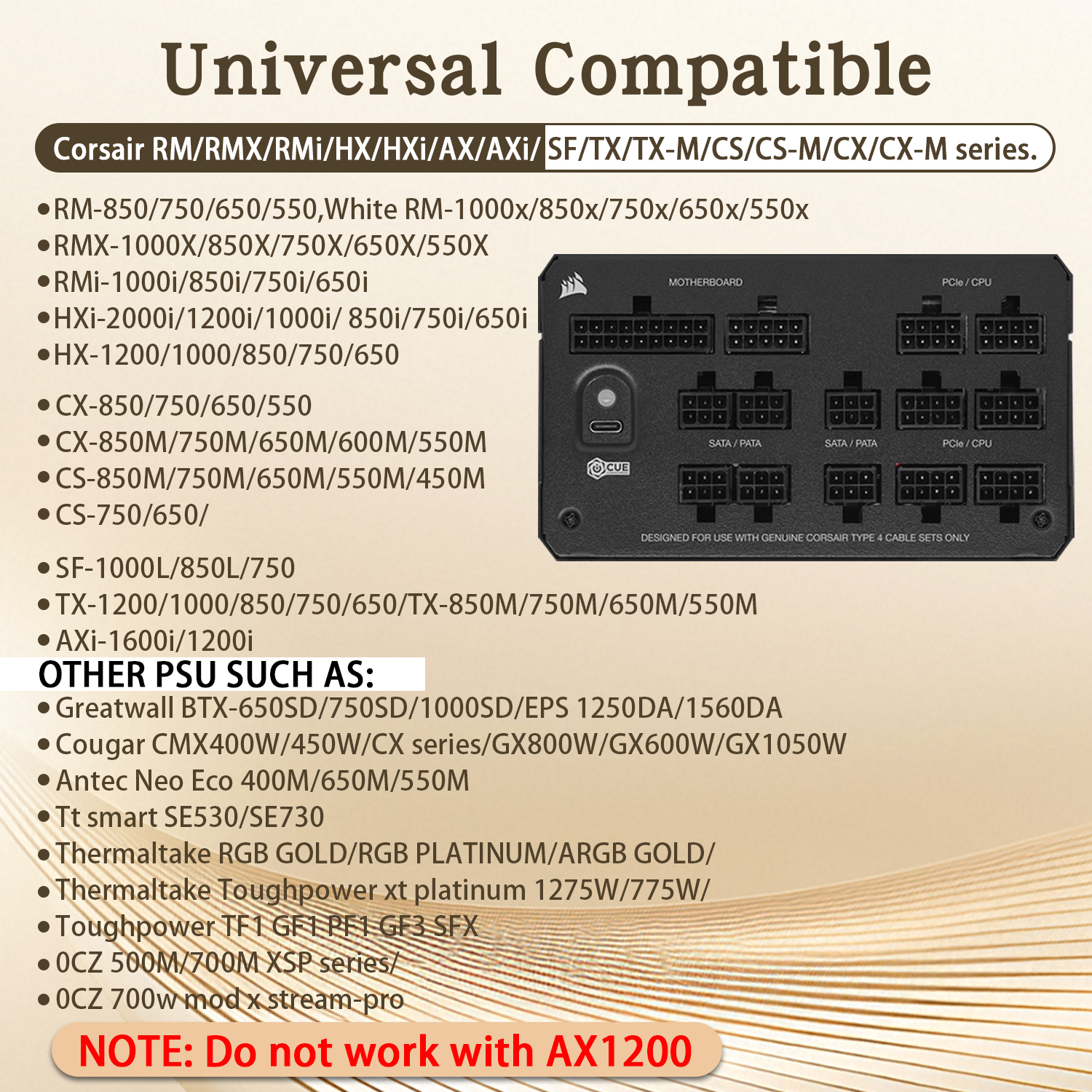 • Compatibility: Compatible with Corsair RM/RMX/RMi/HX/HXi/AX/AXi/SF/TX/TX-M/CS/CS-M/CX/CX-M series, Greatwall BTX-650SD/750SD/1000SD/EPS 1250DA/1560DA, Cougar CMX400W/450W/CX series/GX800W/GX600W/GX1050W,Antec Neo Eco 400M/650M/550M, Tt smart SE530/SE730, Thermaltake RGB GOLD, RGB PLATINUM, ARGB GOLD, Thermaltake Toughpower xt platinum 1275W/775W, OCZ 500M/700M XSP series, Toughpower TF1 GF1 PF1 GF3 SFX, OCZ 700w mod x stream-pro; (NOTE: Do not work with AX1200). (Please refer to the compatible images on the product page for more compatible models).