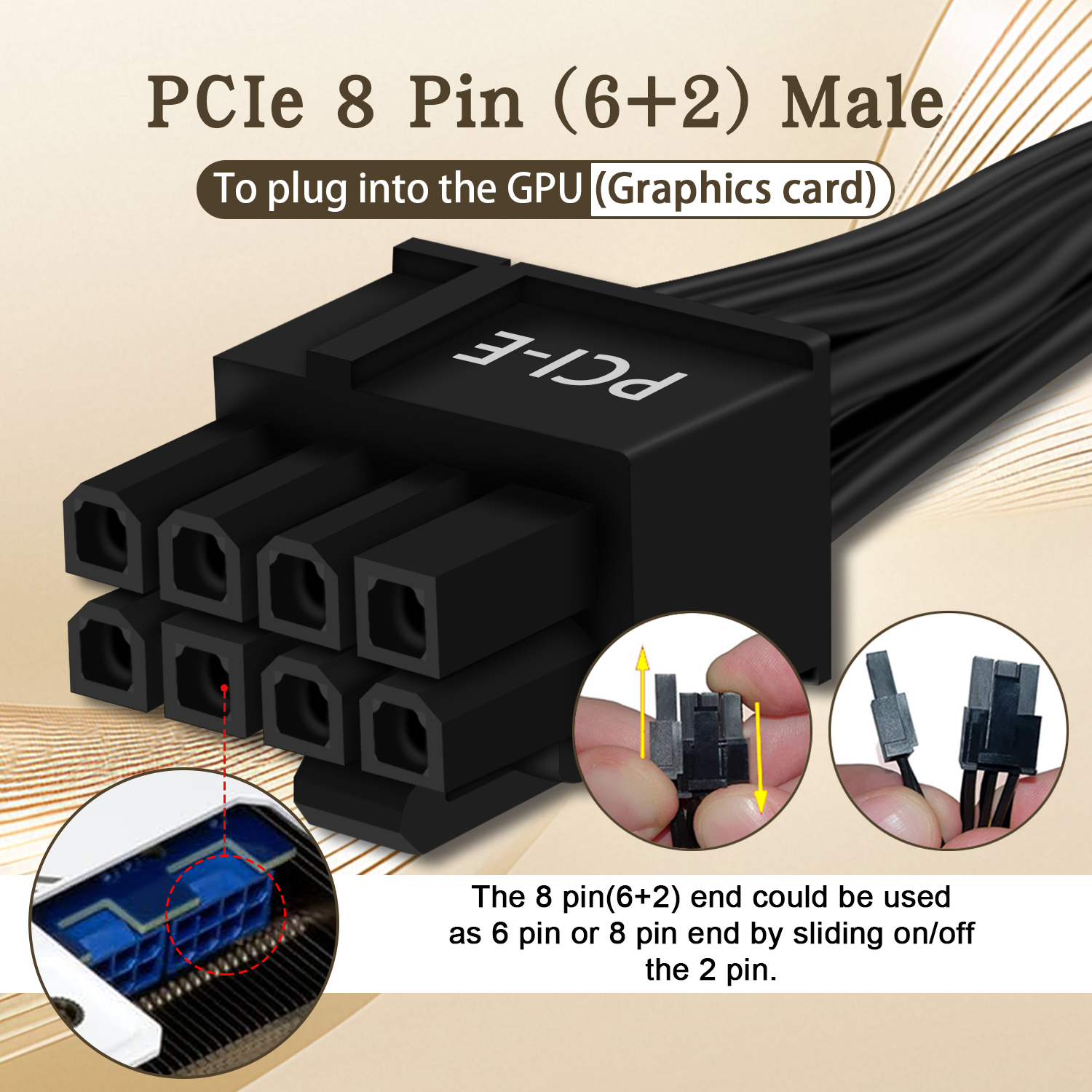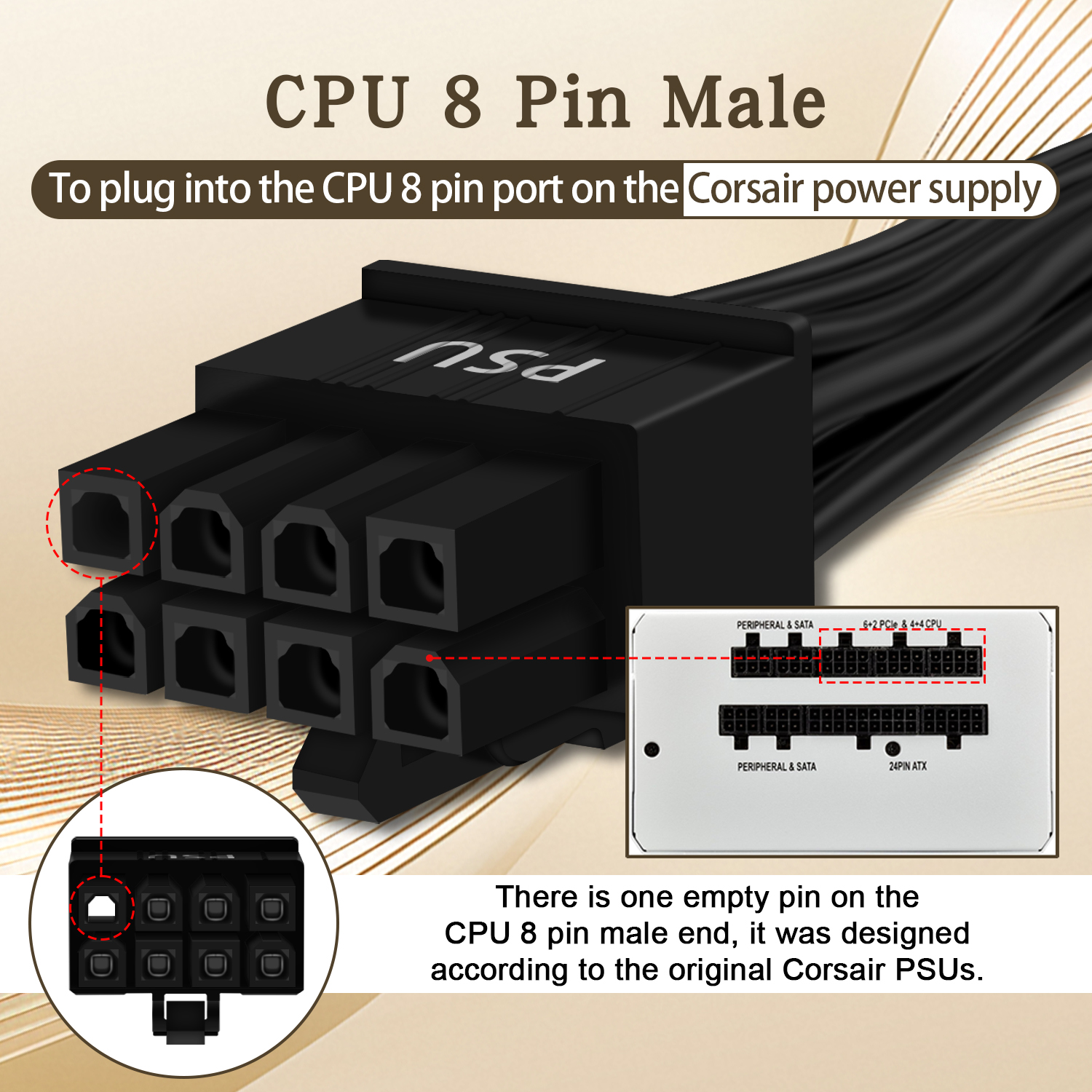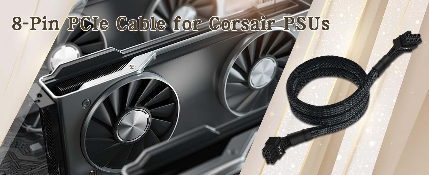 • 8 Pin PCIe Cable for Corsair PSUs: ATX 8 pin male end to plug into the power supply (NOTE: the 8 pin male connector is ATX 8 pin, not pci-e 8 pin.) and PCIe 8 pin(6+2) male end to plug into the video graphics card.(NOTE: the 8 pin end and 8 pin(6+2) male end cannot be used interchangeably);