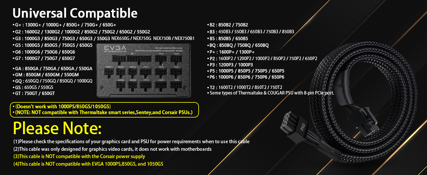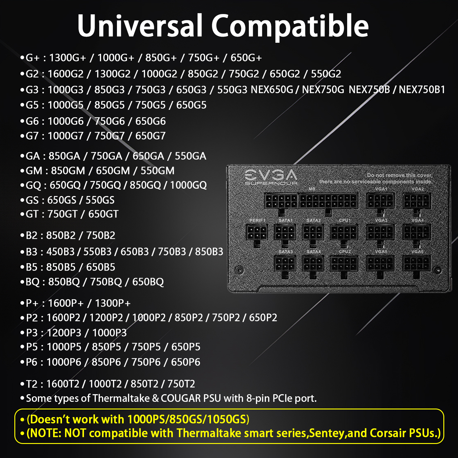 Compatibility: Compatible with Silverstone, EVGA semi-modular 650GQ/750GQ/850GQ/1000GQ 1600T2/1000T2/850T2/750T2 1600P2/1200P2/1000P2/850P2/750P2/650P2 1600G2/1300G2/1000G2/850G2/750G2/650G2/550G2 1000G3/850G3/750G3/650G3/550G3 NEX650G/NEX750G NEX750B/750B1 SUPERNOVO B2 850w 450B3/550B3/650B3/750B3/850B3 Supernova 850 GA 850BQ/750BQ 650GS/550GS (Doesn't work with 1000PS/850GS/1050GS), some types of Thermaltake & COUGAR PSU with 8 pin PCIe port. (NOTE: NOT Compatible with Corsair Power Supply), (Please refer to the compatible images on the product page for more compatible models).