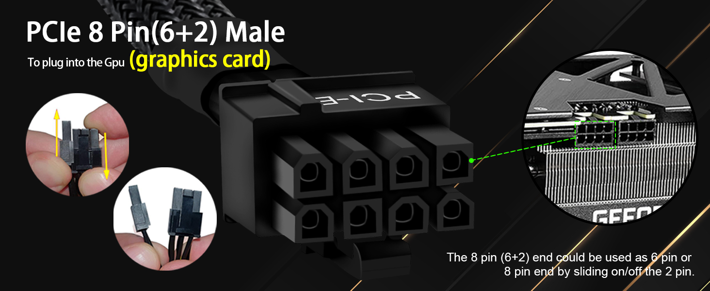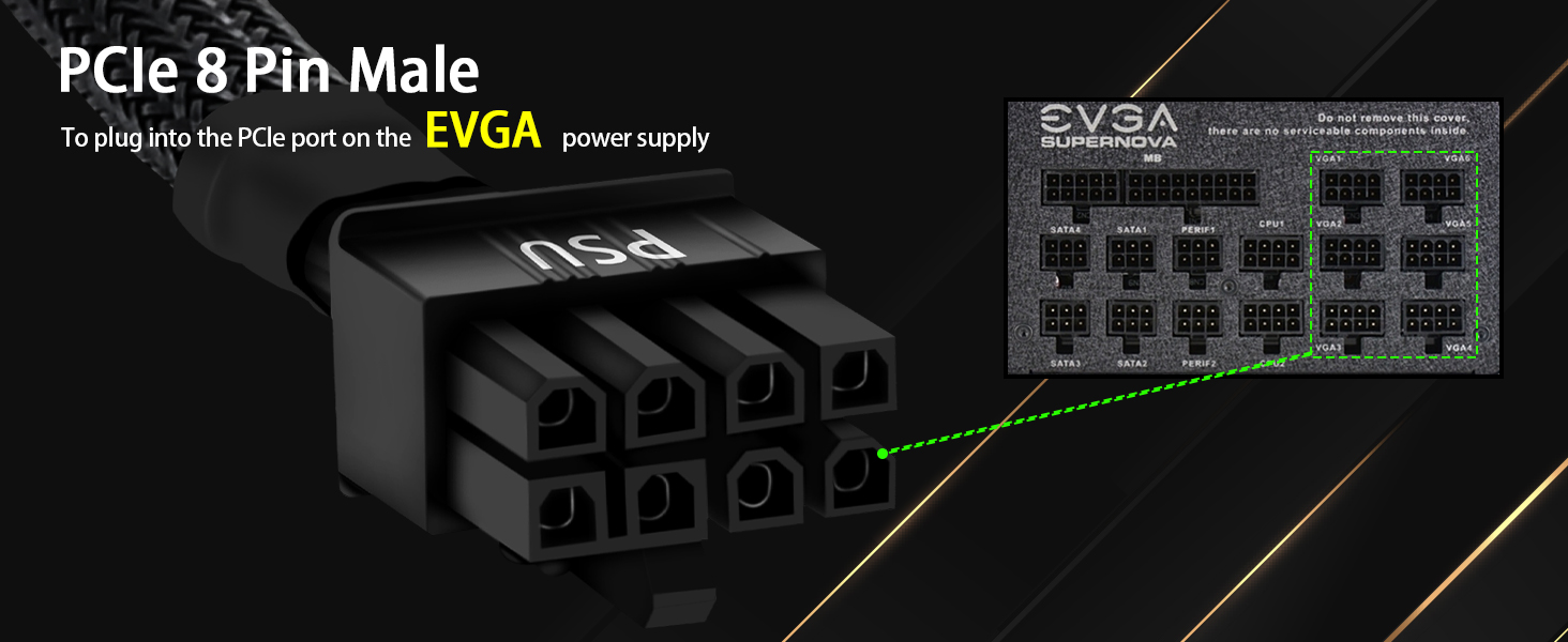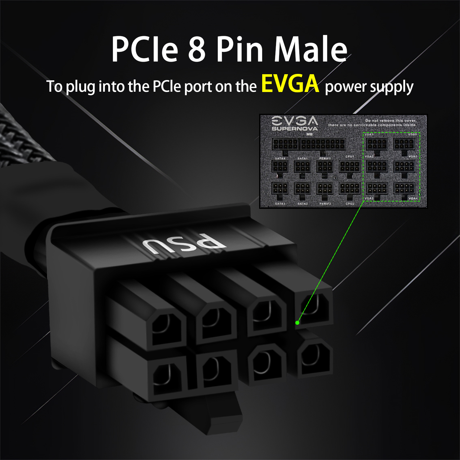 8 Pin PCIe Cable for EVGA Power Supply:PCIe 8 pin male end to plug into the power supply(Please make sure that the 8 pin port on your power supply is pcie 8 pin port , not cpu 8 pin port when to buy it.) and 8 pin(6+2) male end to plug into the video graphics card.(NOTE: the 8 pin end and 8 pin(6+2) male ends cannot be used interchangeably);