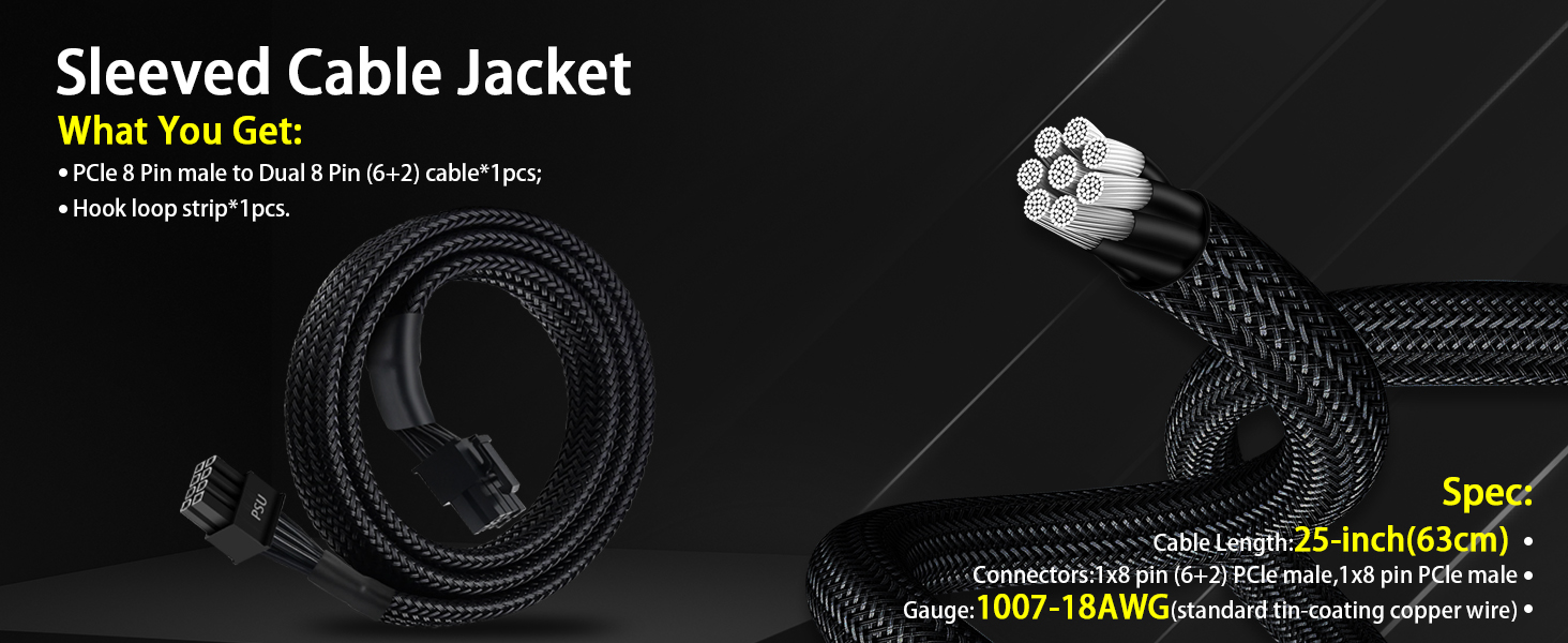 Parameter: Length(including connectors): 25-inch(63cm), Gauge: 1007-18AWG(standard tin-coating copper wire), Quantity: 1pcs, Hook loop strip*1pcs (only designed for graphics vedio cards, it will not work with motherboards);