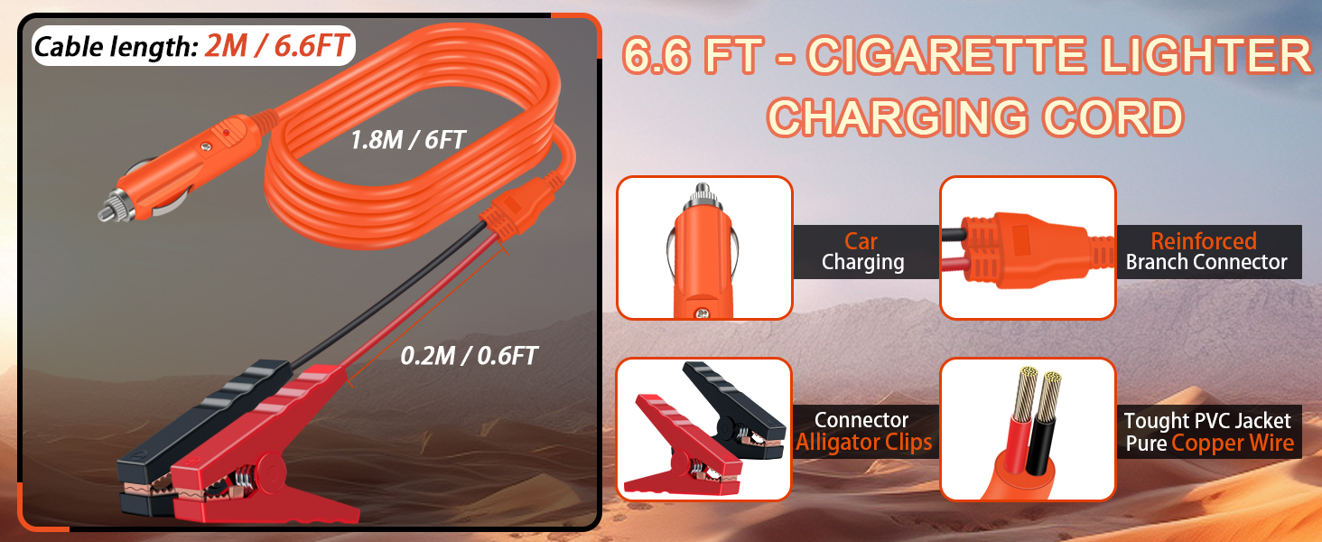 - High-Quality Materials - This car charging cable for Jackery is designed with 100% copper 14AWG heavy-duty wire, ensuring maximum durability and excellent conductivity. The cigarette lighter plug includes a built-in 15A fuse to increase safety, and the 6.6FT (2m) cable length provides sufficient insulation protection to prevent exposed metal.