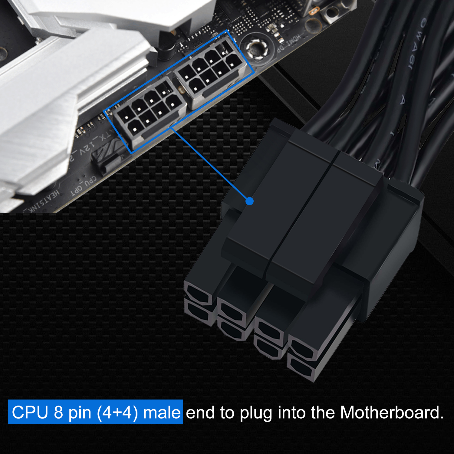『CPU Cable for Corsair PSU』(Do not work with GPU(graphics card)). CPU 8 pin male end to plug into the power connector of power supply; CPU 8 pin (4+4) male end to plug into the Motherboard.(NOTE: the 8 pin end and 4+4 pin male ends cannot be used interchangeably);