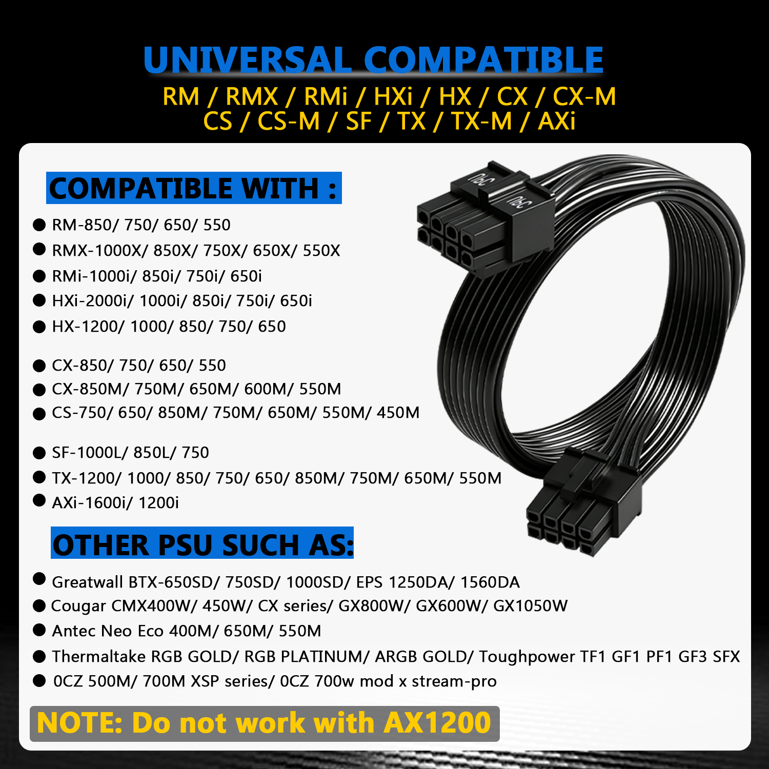 『Compatibility』 Only compatible with RMi, RMX, RM, SF, AX,AXI,HX,TX-M,CX-M,AX760I/AX860I/AX1200I/AX1500I/AX760/AX850/AX860/HX1200I/HX1000I/HX850I/HX750I/RM1000I/RM850I/RM750I/RM650I/RM1000X/RM850X/RM750X/RM650X/RM550X/RM1000/RM850/RM750/RM650/RM550/RM450/SF750/SF600/SF450/HX750/HX1200/TX850M/TX750M/TX650M/CX750M/CX650M/CX550M; (NOTE: Do not work with AX1200 and other PSUs.)
