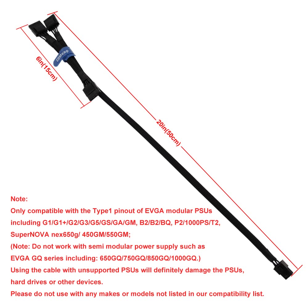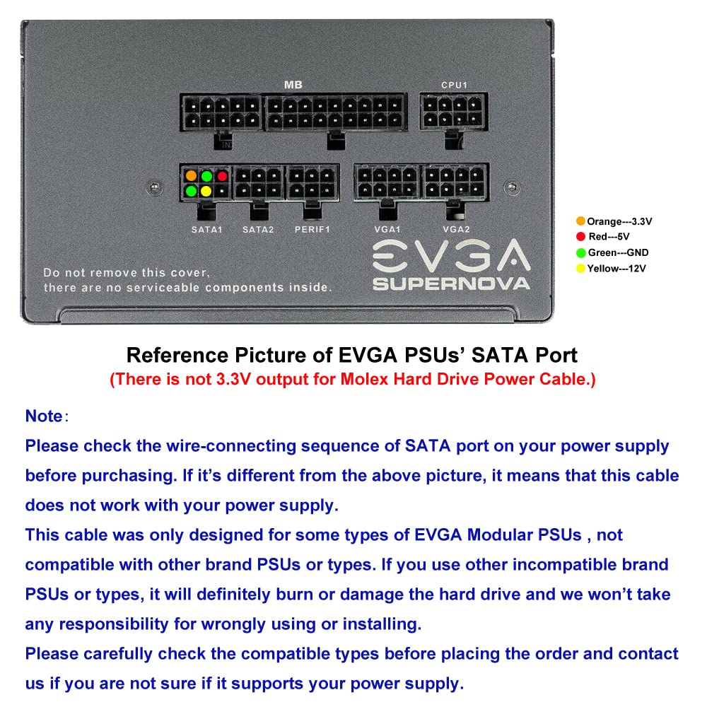 『Molex Power Cable for EVGA PSUs』Compatible with the Type1 pinout of EVGA modular PSUs including G1/G1+/G2/G3/G5/GS/GA/GM, B2/B2/BQ, P2/T2, SuperNOVA nex650g/ 450GM/550GM;(Note: Do not work with 1000PS/850GS/1050GS and semi modular power supply such as EVGA GQ series including: 650GQ/750GQ/850GQ/1000GQ.)