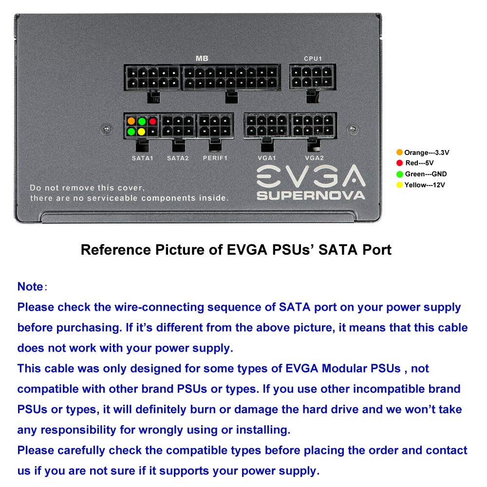 『Note』This cable was only designed for the types of EVGA PSUs listed in the 1st point, not compatible with other brand PSUs and semi modular EVGA PSUs. If you use other incompatible PSUs, it will definitely burn or damage the hard drive and we won’t take any responsibility for wrongly using or installing. Please carefully check the compatible types or contact us if you are not sure if it supports your power supply;